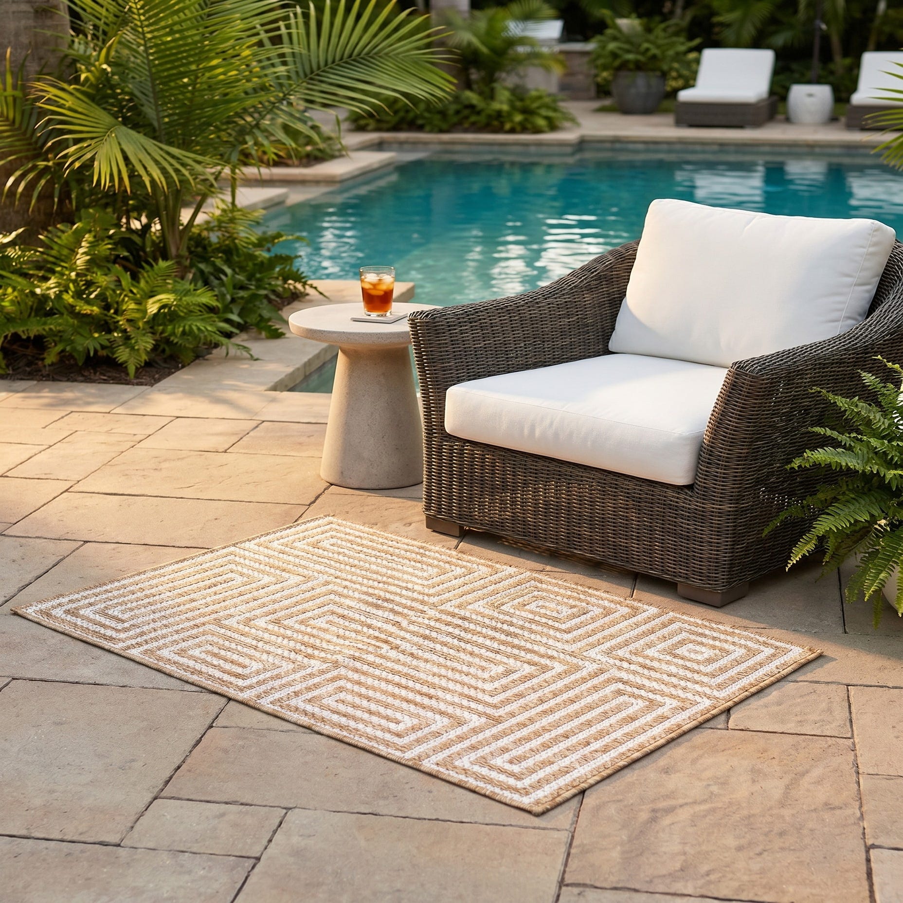 Love the contemporary look of this rug! We are so happy we chose this to accent the blue of our pool with our living area on our lanai. We still are going to add a few more pillows but love the rug to add color.