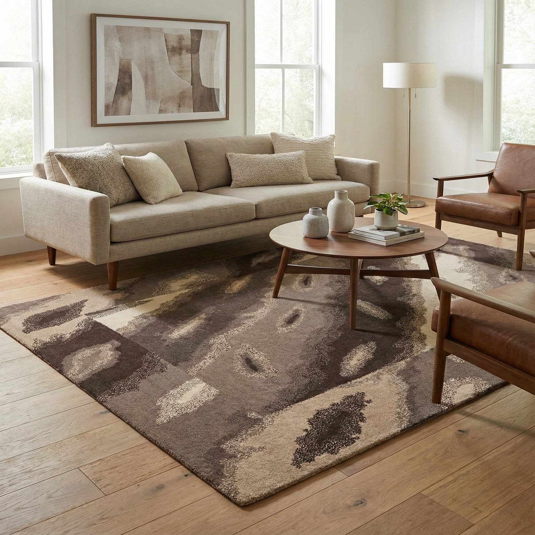 Primary color is Taupe. Colors in this rug include: Taupe, Brown, Light Brown, Ivory, Tan.