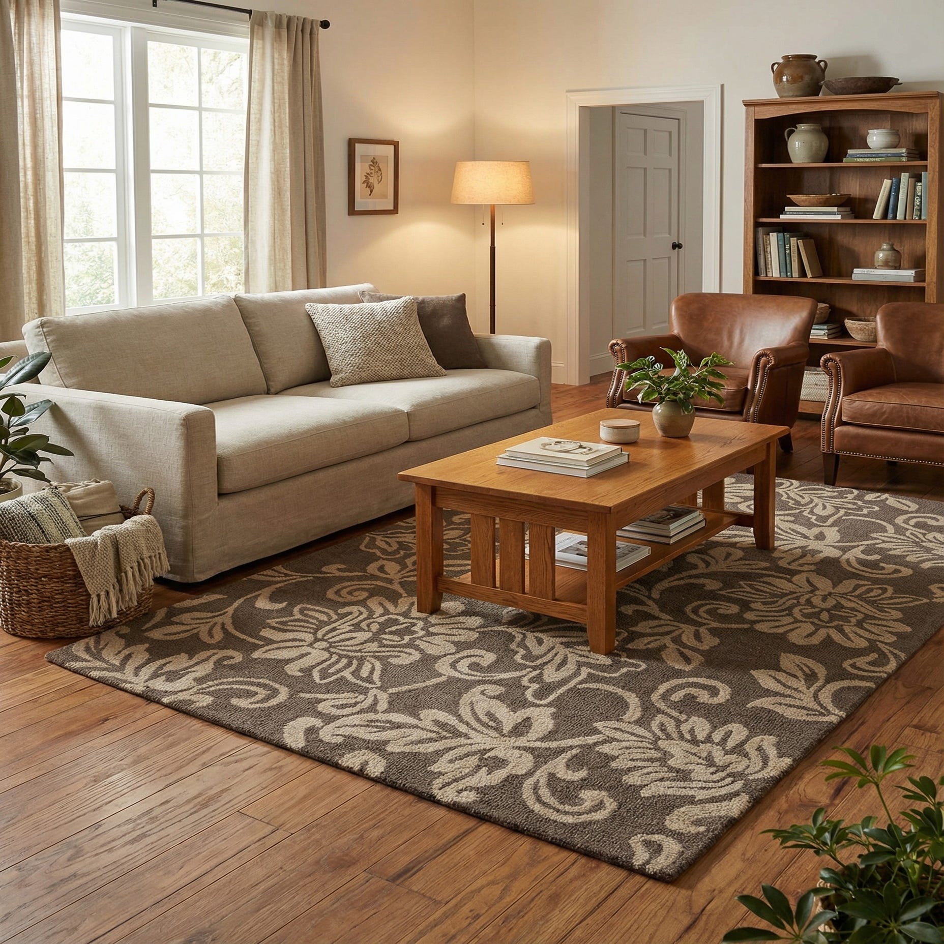 Primary color is Taupe. Colors in this rug include: Taupe, Ivory.