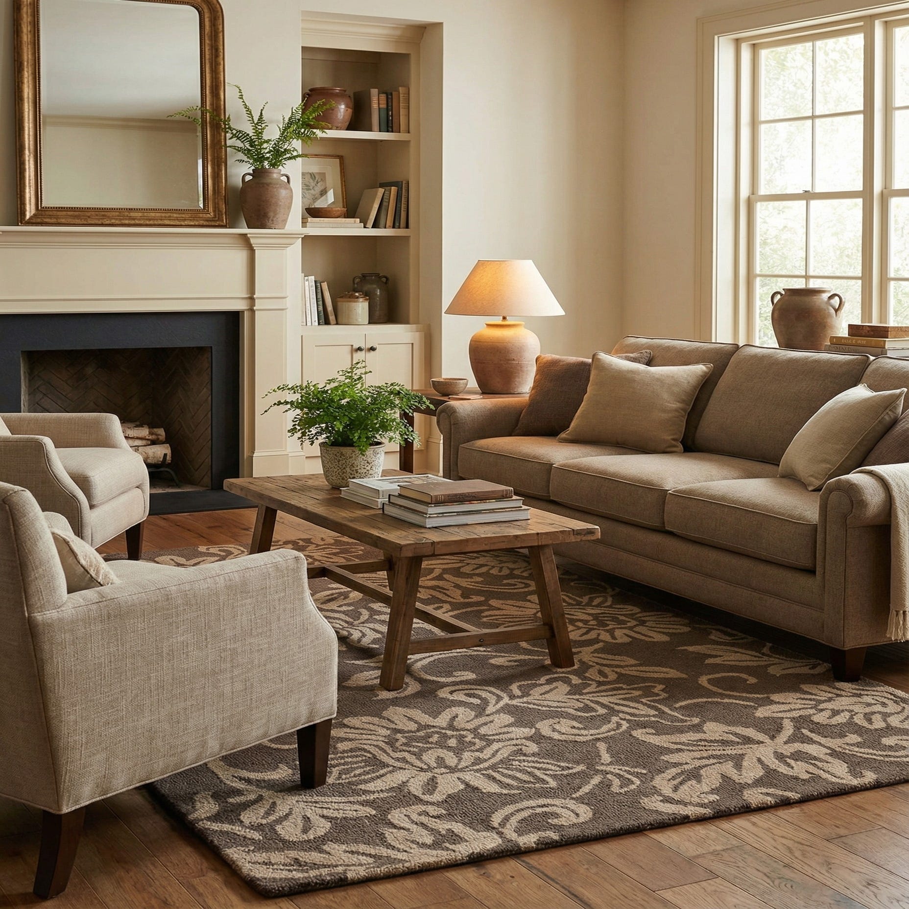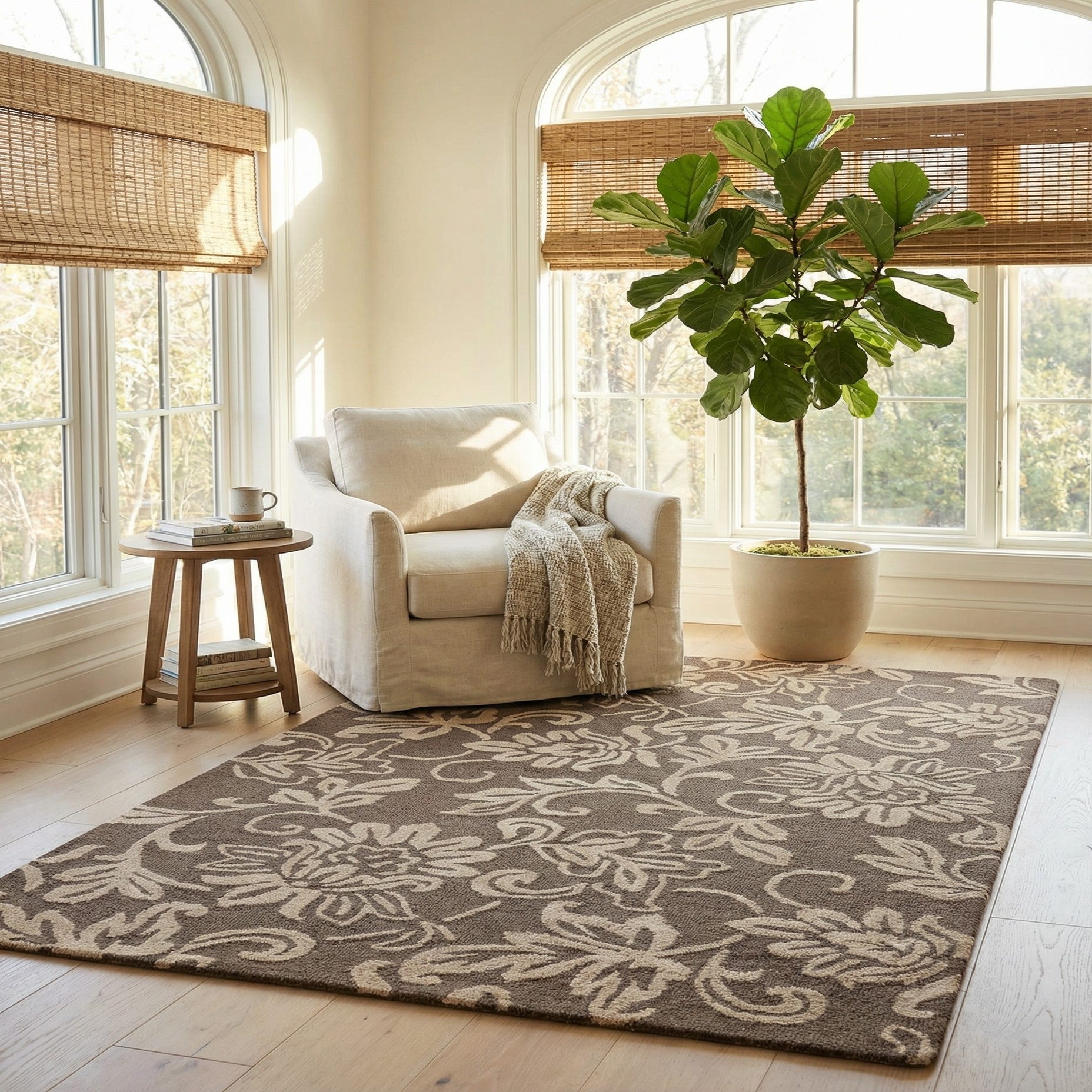 Primary color is Taupe. Colors in this rug include: Taupe, Ivory.