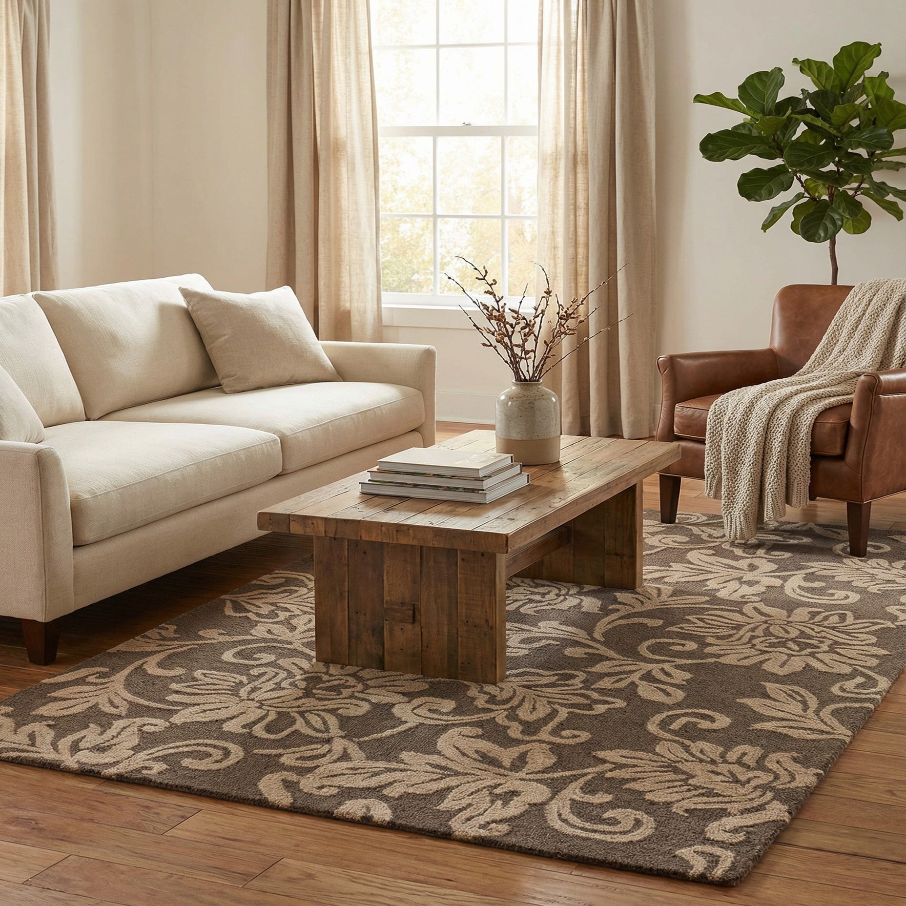 Primary color is Taupe. Colors in this rug include: Taupe, Ivory.