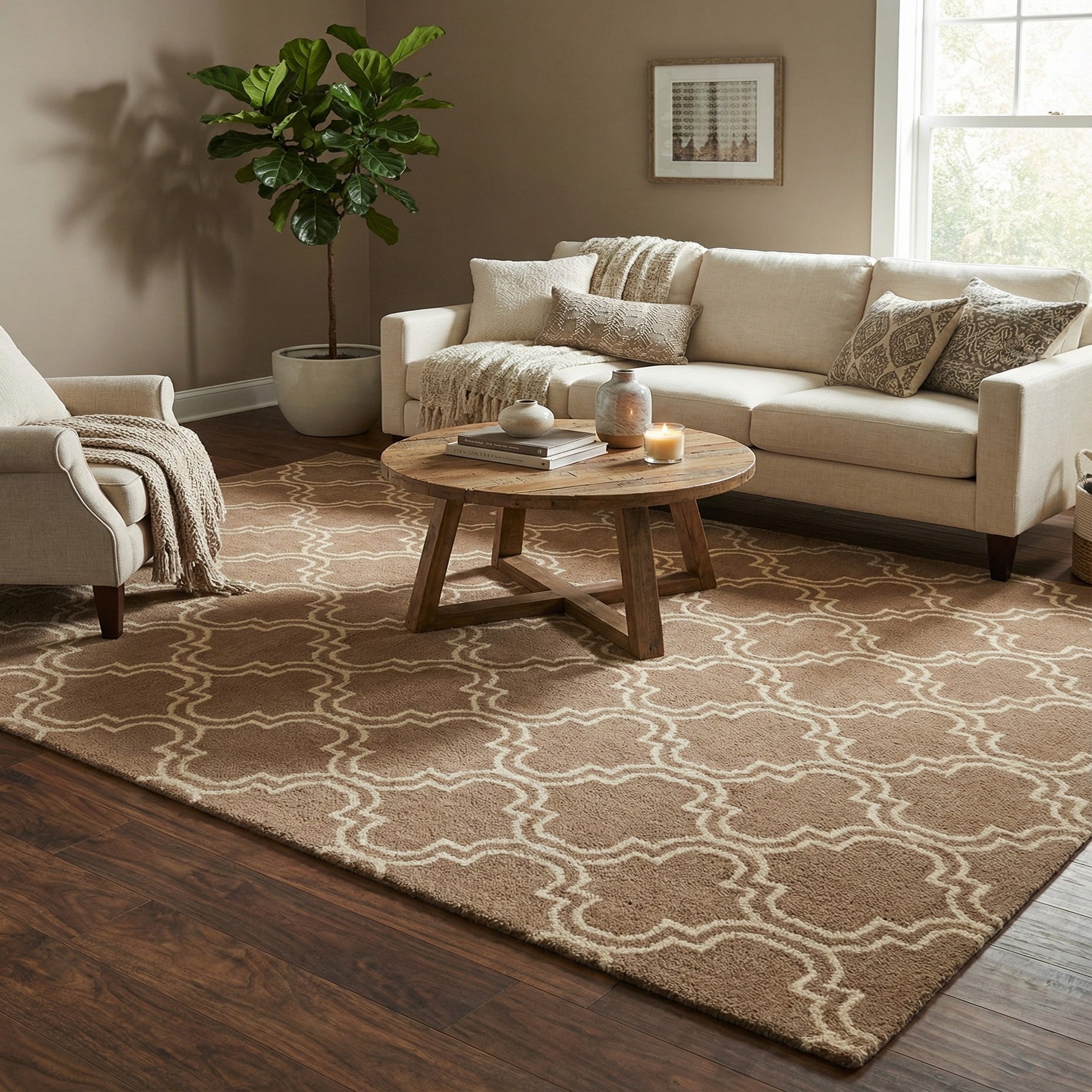 Primary color is Taupe. Colors in this rug include: Taupe, Ivory.