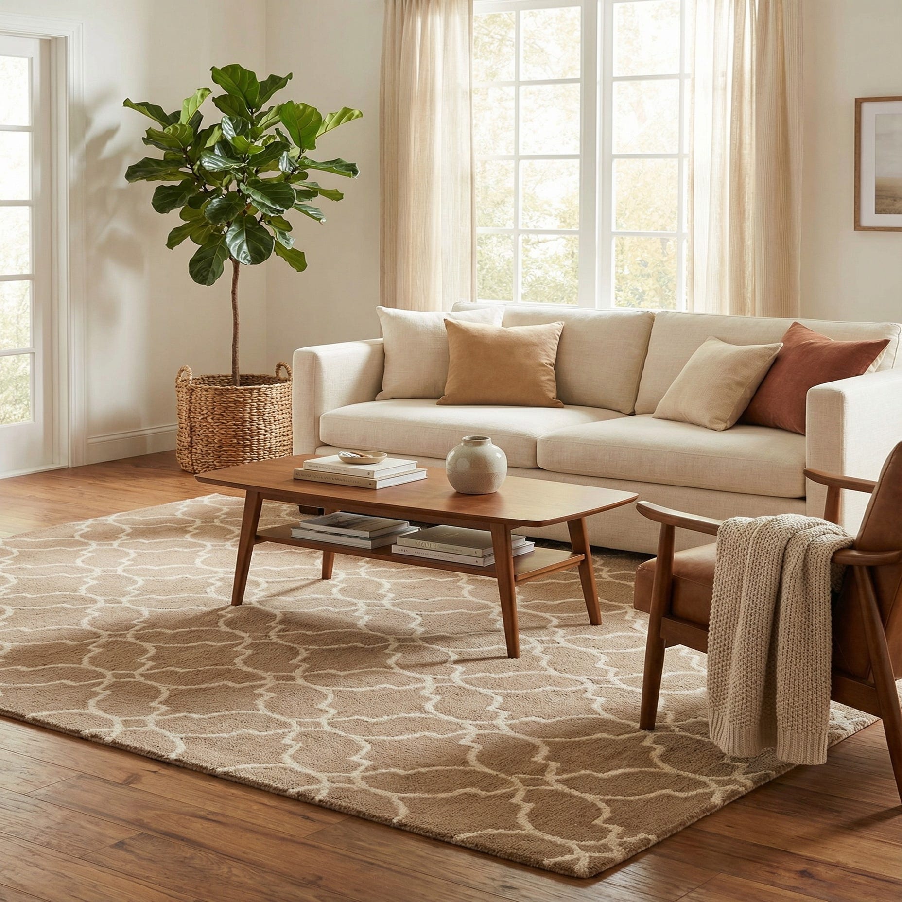 Primary color is Taupe. Colors in this rug include: Taupe, Ivory.