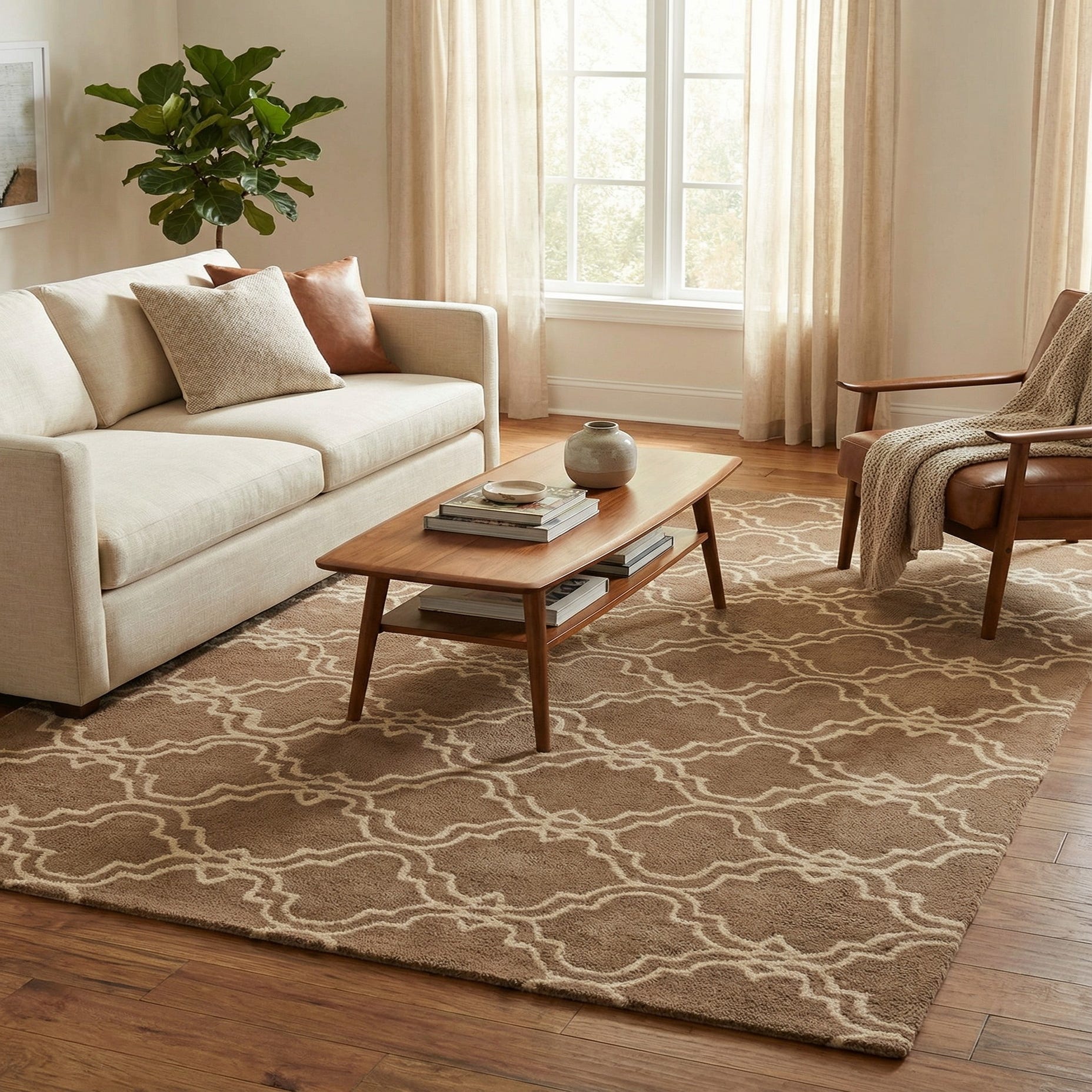 Primary color is Taupe. Colors in this rug include: Taupe, Ivory.