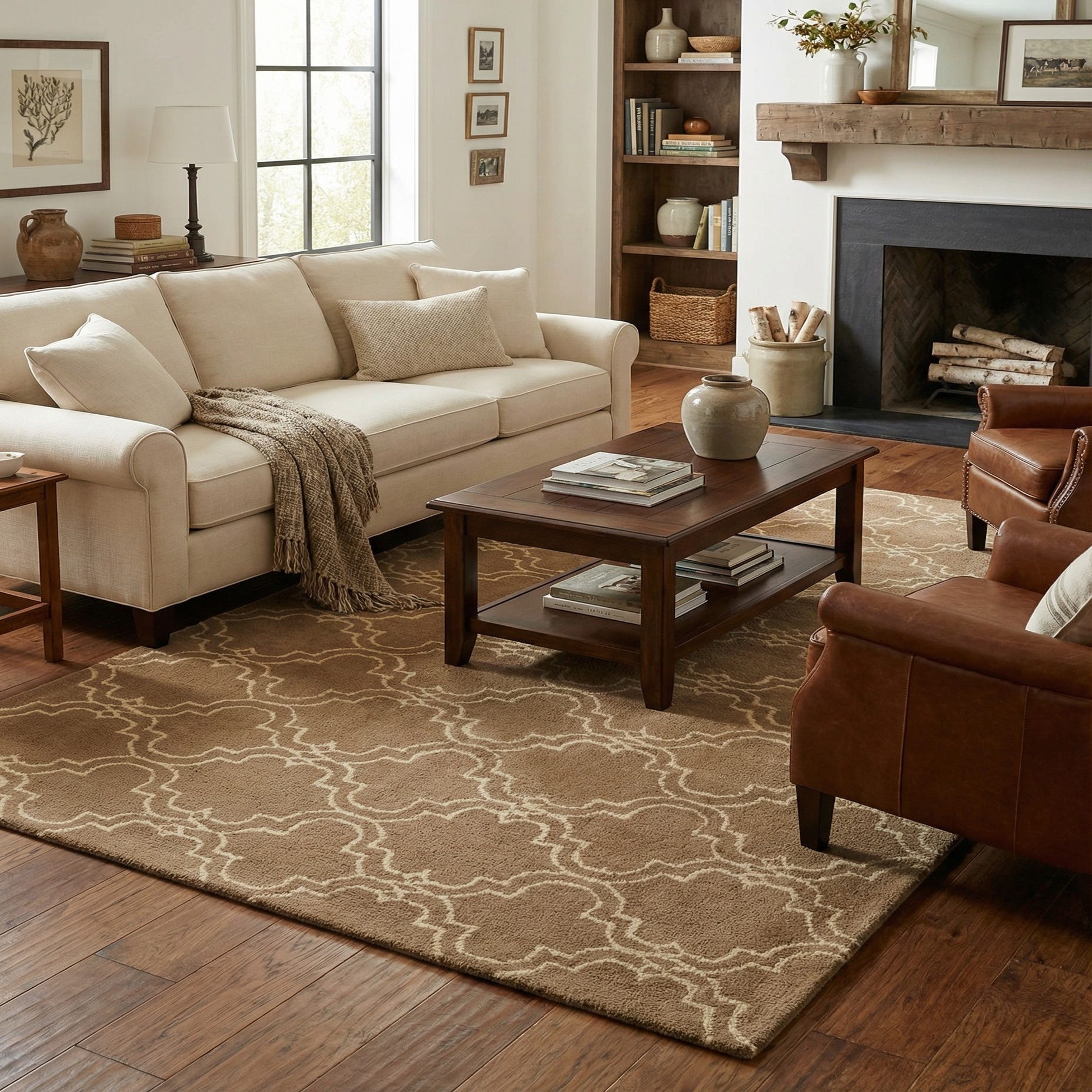 Primary color is Taupe. Colors in this rug include: Taupe, Ivory.