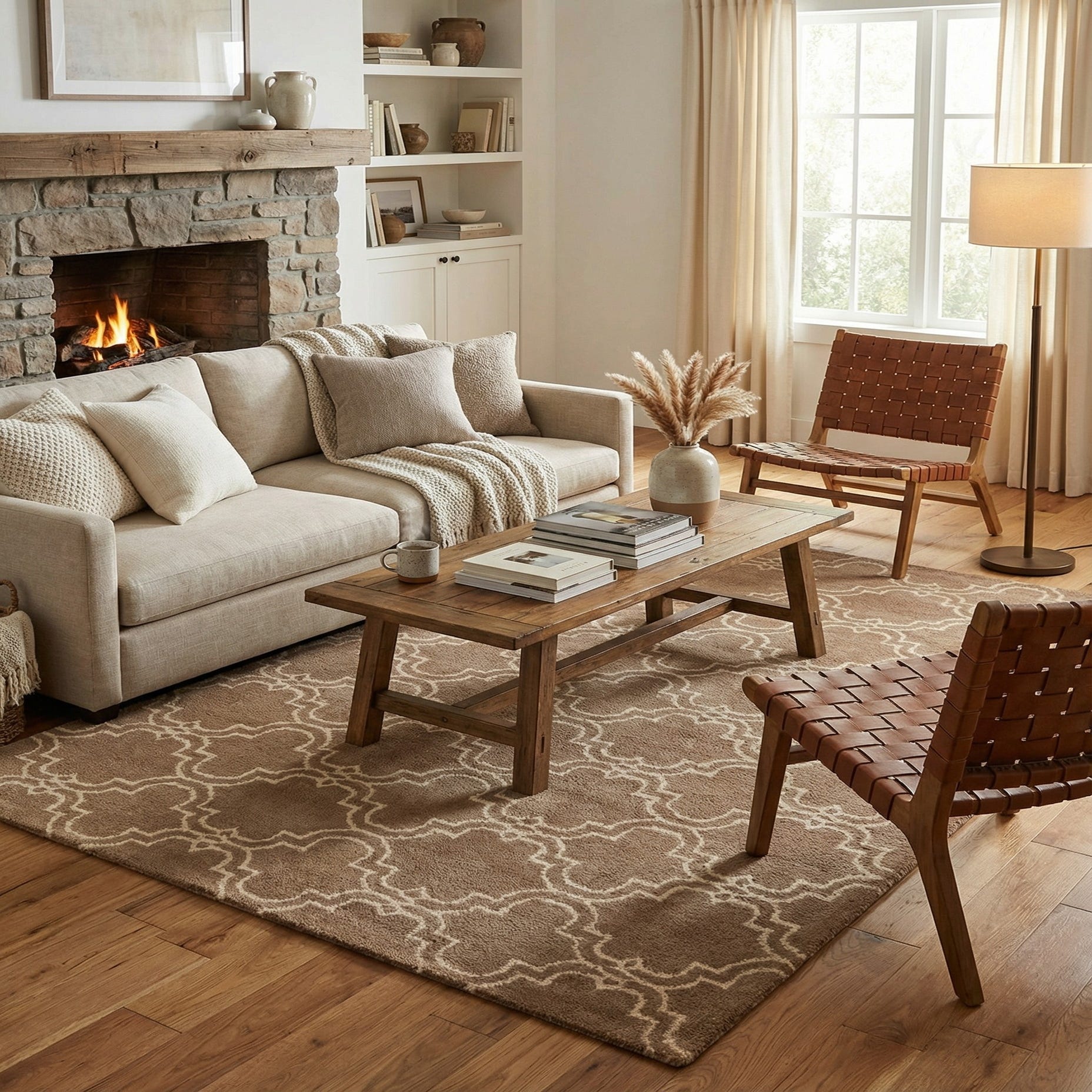 Primary color is Taupe. Colors in this rug include: Taupe, Ivory.