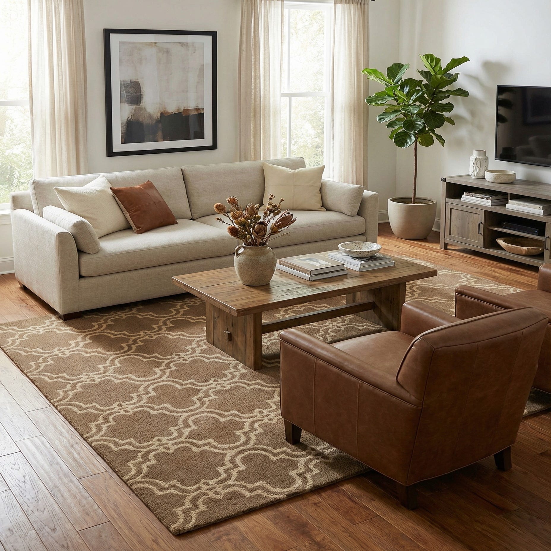 Primary color is Taupe. Colors in this rug include: Taupe, Ivory.