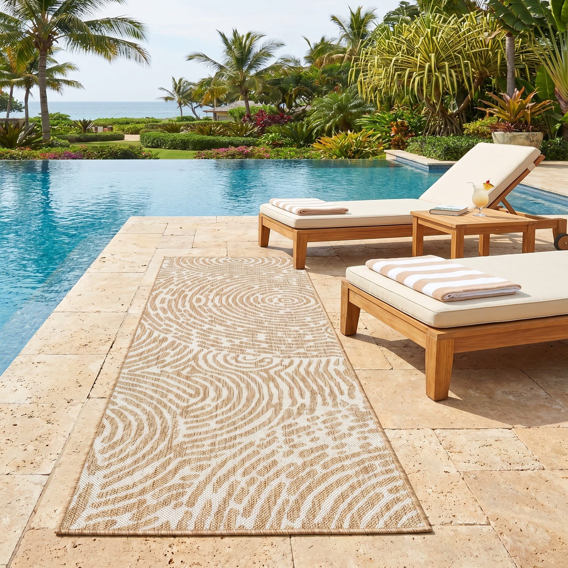 Love the contemporary look of this rug! We are so happy we chose this to accent the blue of our pool with our living area on our lanai. We still are going to add a few more pillows but love the rug to add color.