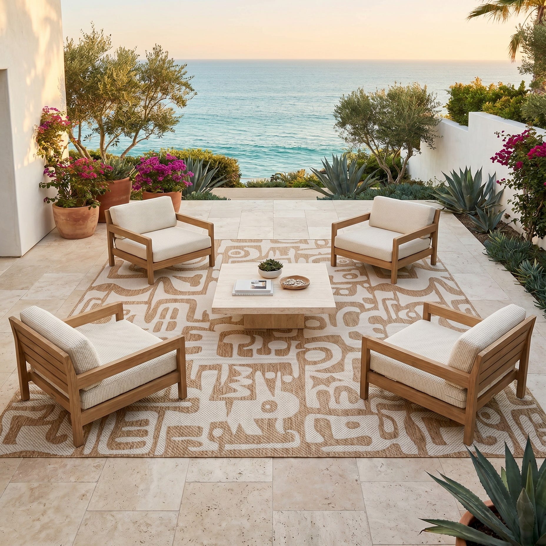 Love the contemporary look of this rug! We are so happy we chose this to accent the blue of our pool with our living area on our lanai. We still are going to add a few more pillows but love the rug to add color.
