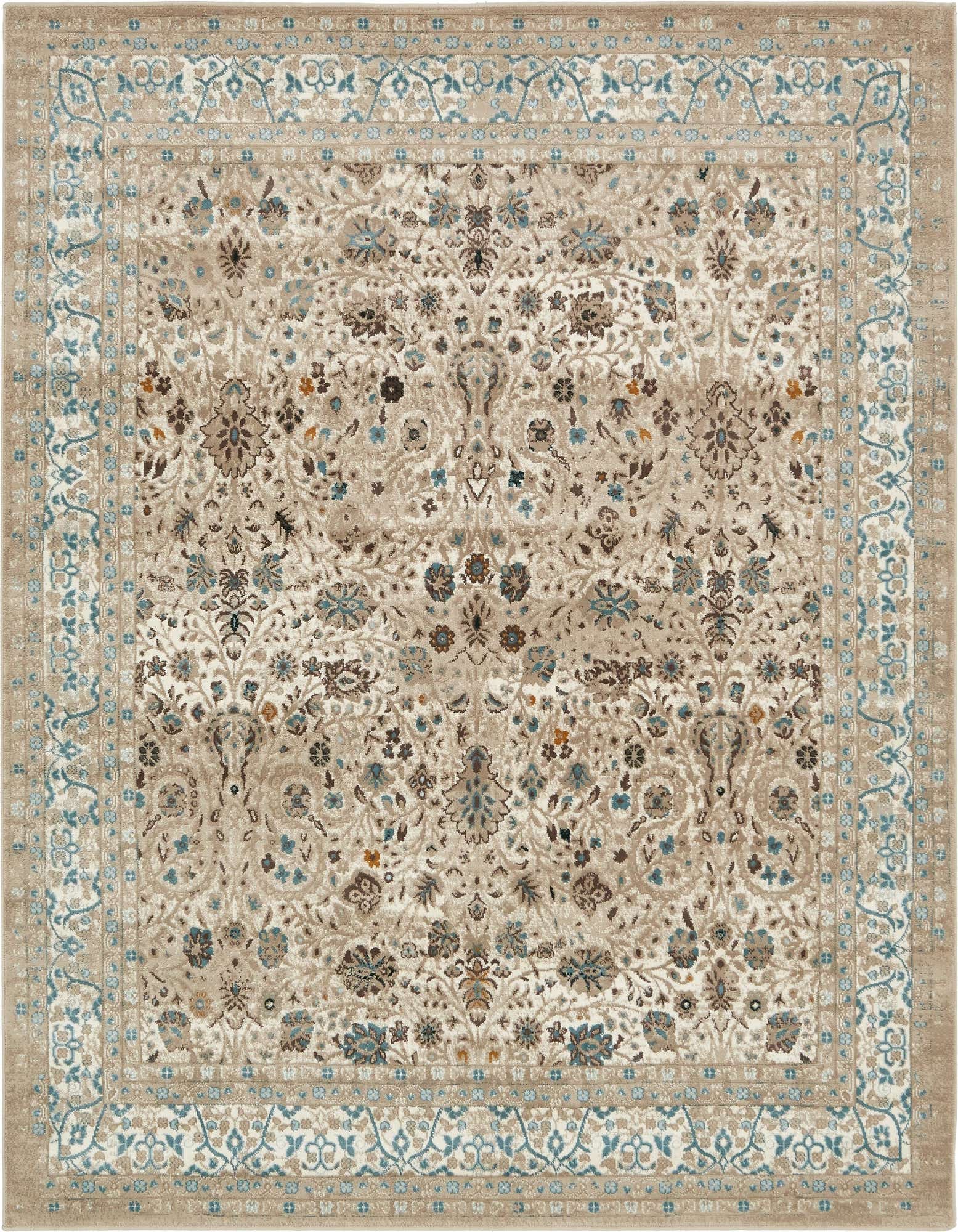 Primary color is Taupe. Colors in this rug include: Taupe, Beige, Blue, Light Blue, Brown.