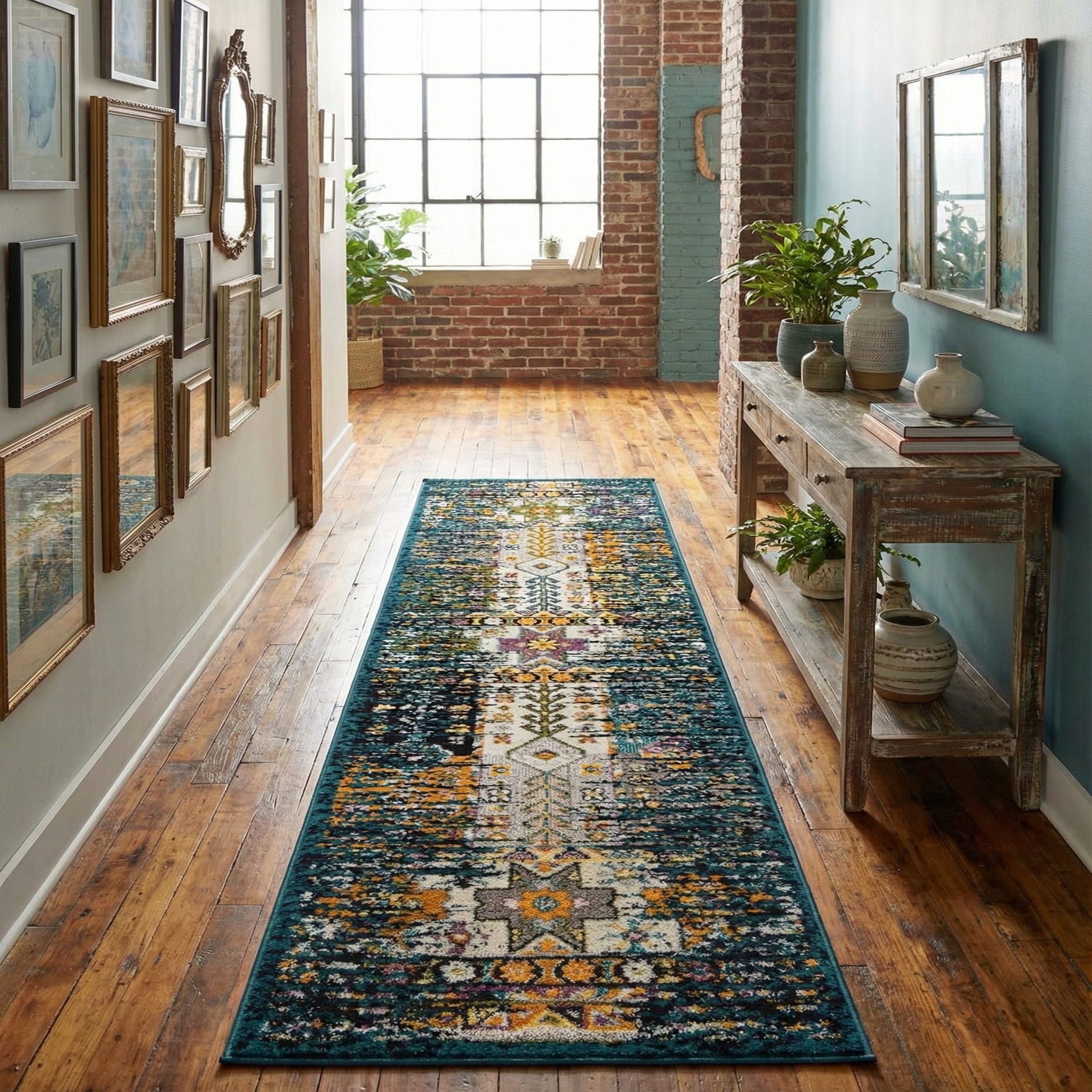 Primary color is Teal. Colors in this rug include: Teal, Beige, Black, Blue, Brown, Gray, Green, Orange, Red, Yellow, Violet.
