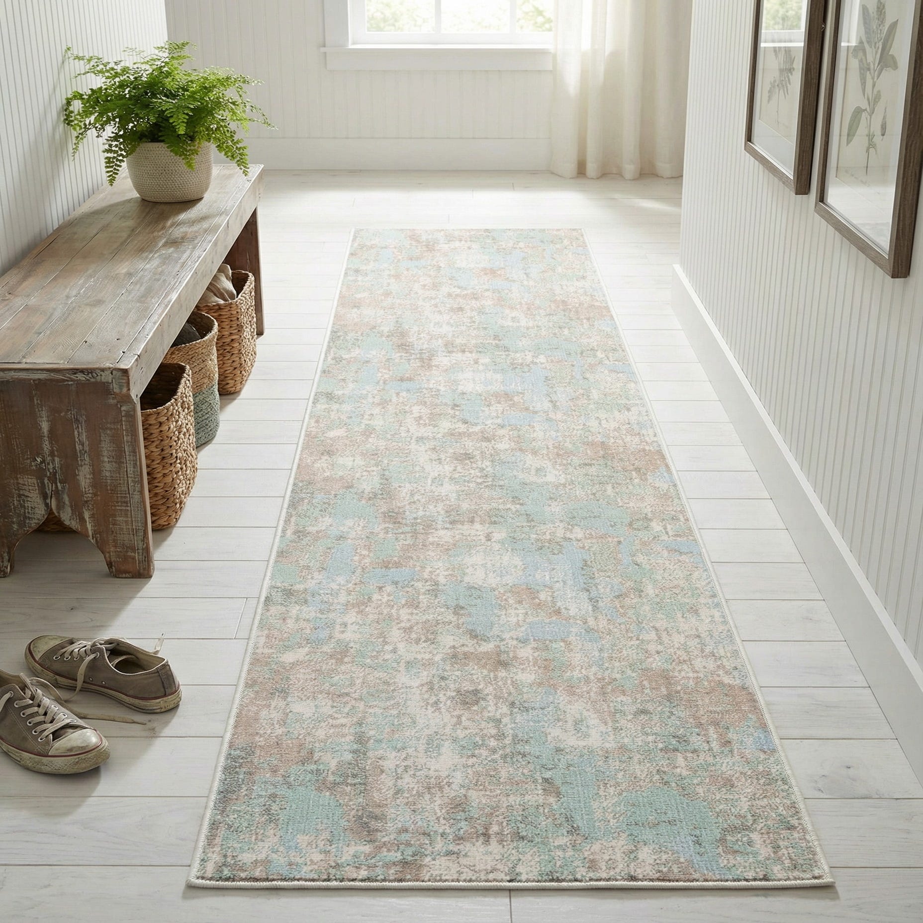 Primary color is Teal. Colors in this rug include: Teal, Beige, Ivory, Light Blue, Gray.