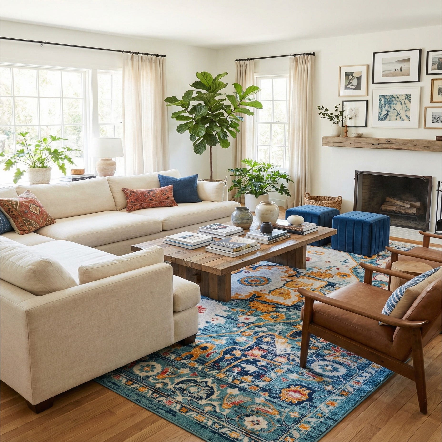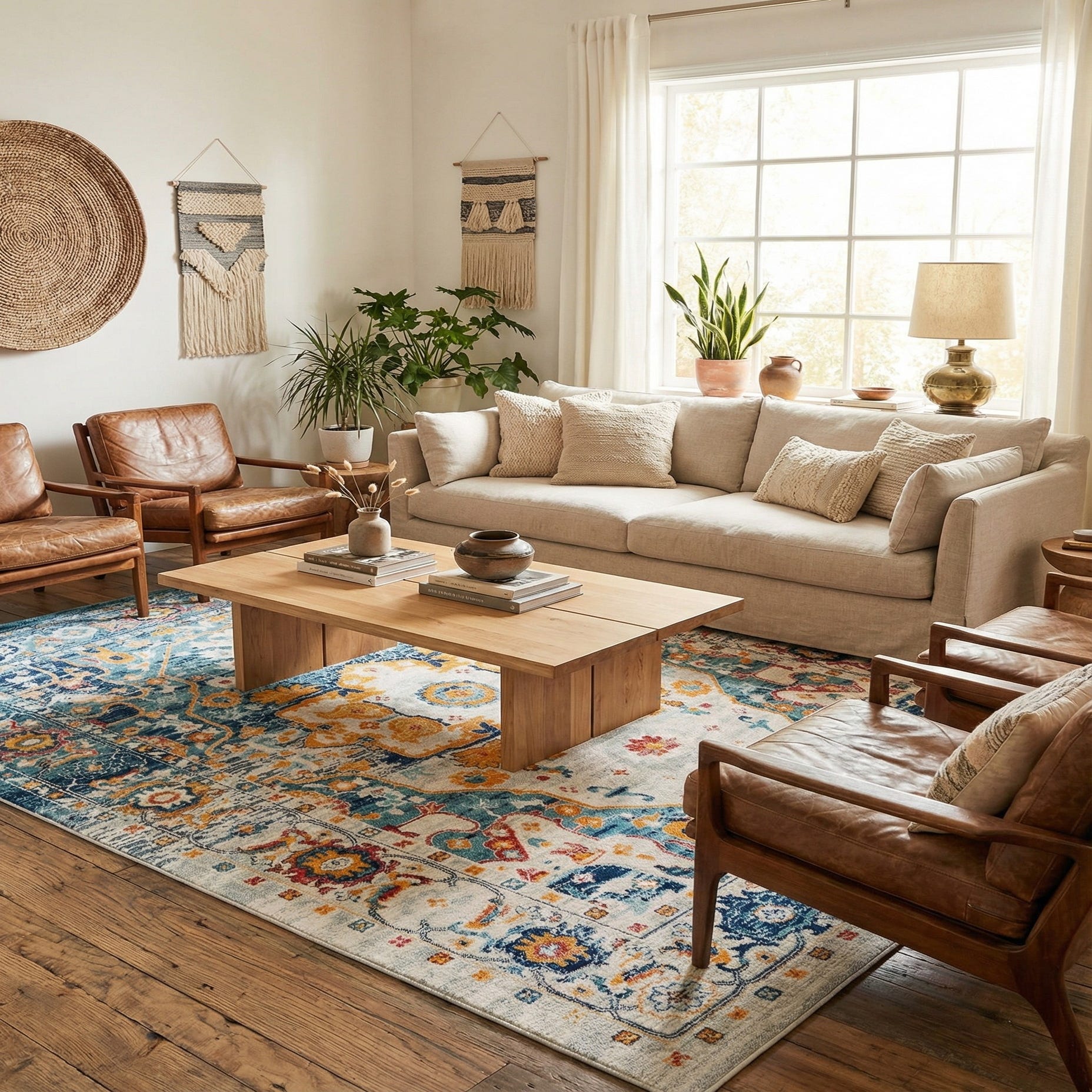 Primary color is Teal. Colors in this rug include: Teal, Ivory, Red, Yellow, Light Blue.