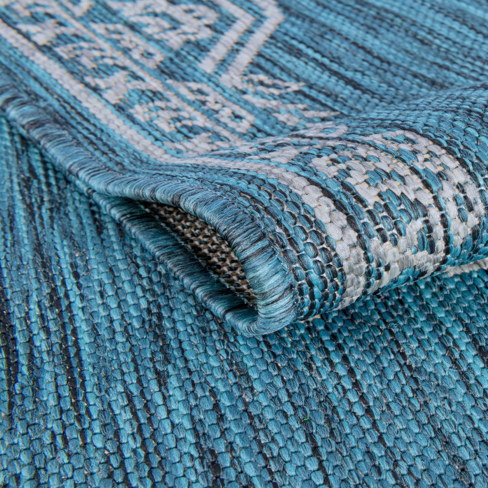 Primary color is Teal. Colors in this rug include: Teal, Gray, Ivory.