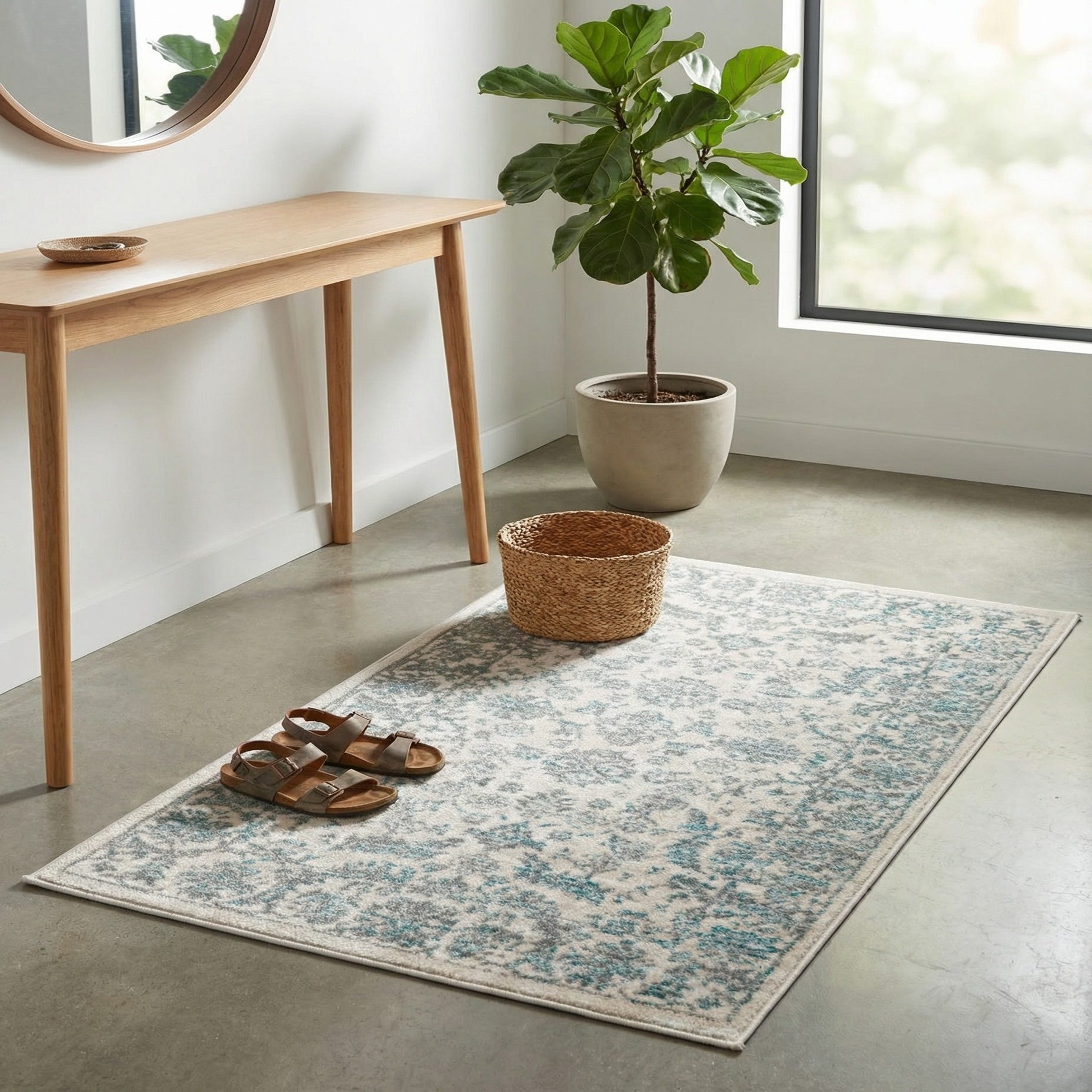 Primary color is Teal. Colors in this rug include: Teal, Ivory.