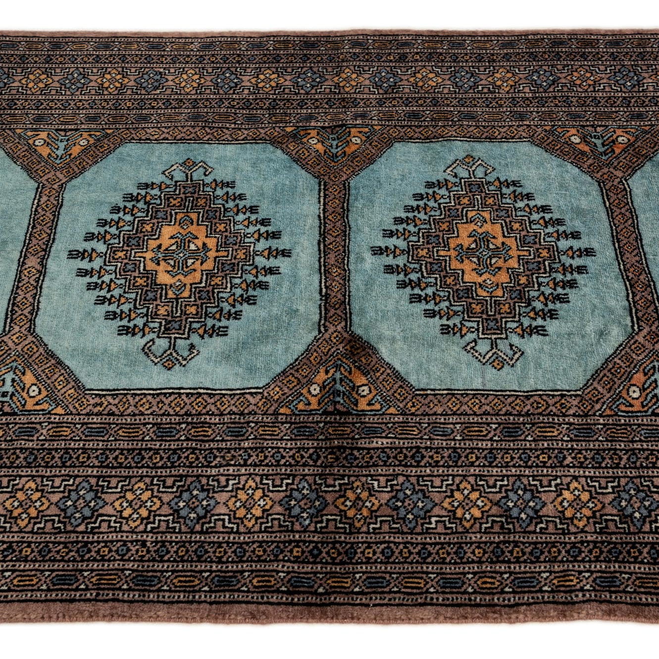 Primary color is Teal. Colors in this rug include: Teal, Beige, Black, Ivory, Light Brown, Gray.