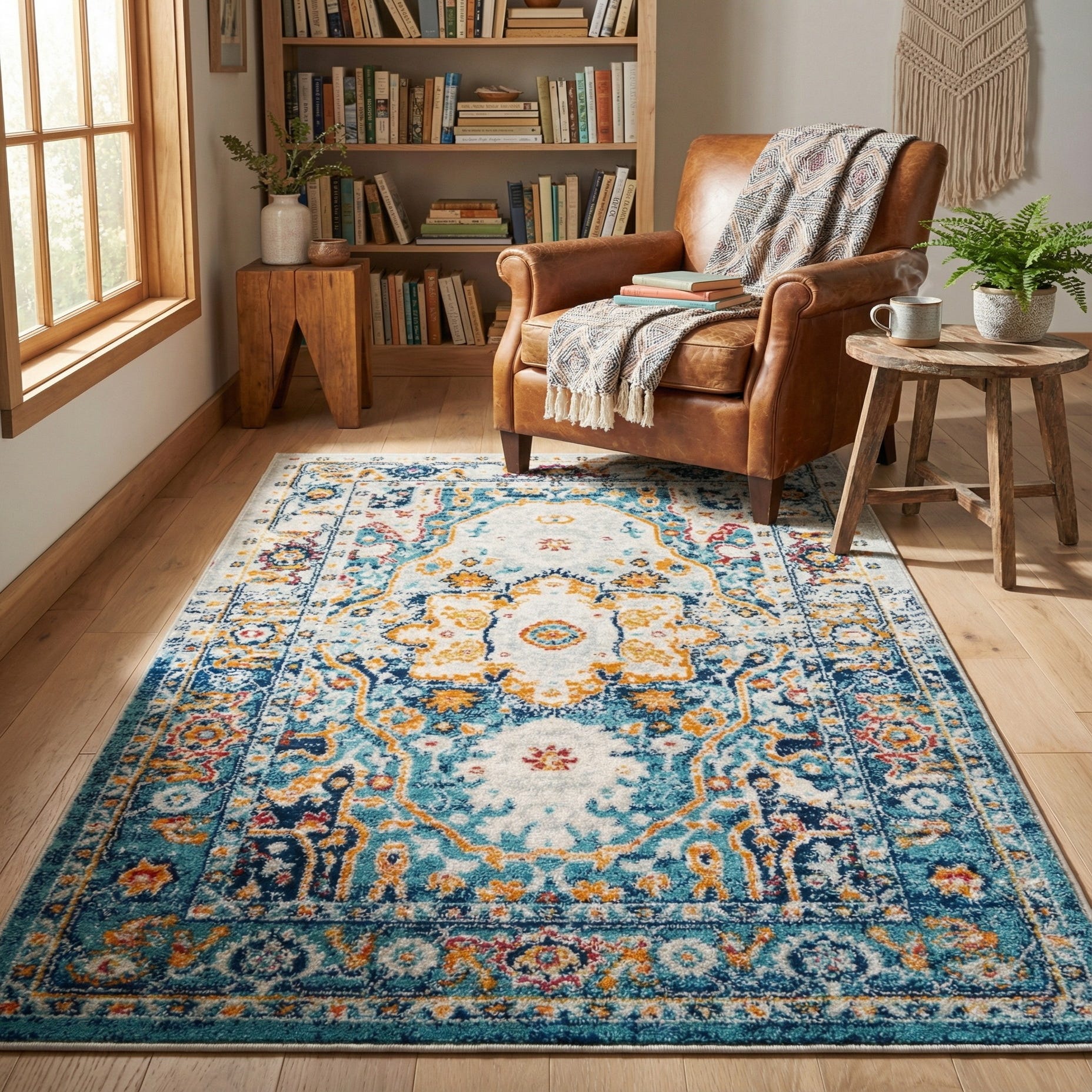Primary color is Teal. Colors in this rug include: Teal, Ivory, Gray, Red, Rust Red, Navy Blue.