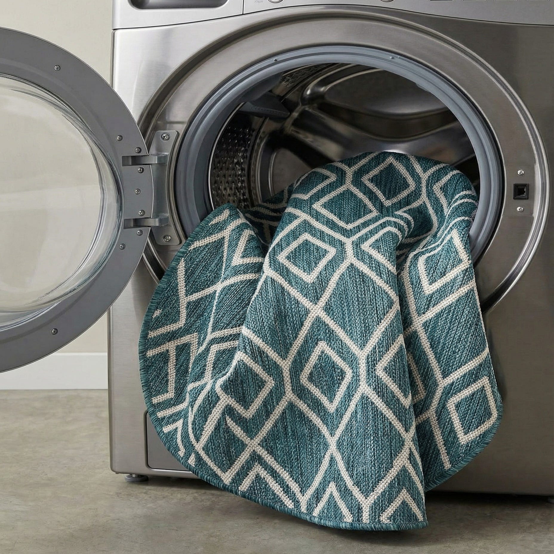 Primary color is Teal. Colors in this rug include: Teal, Ivory.