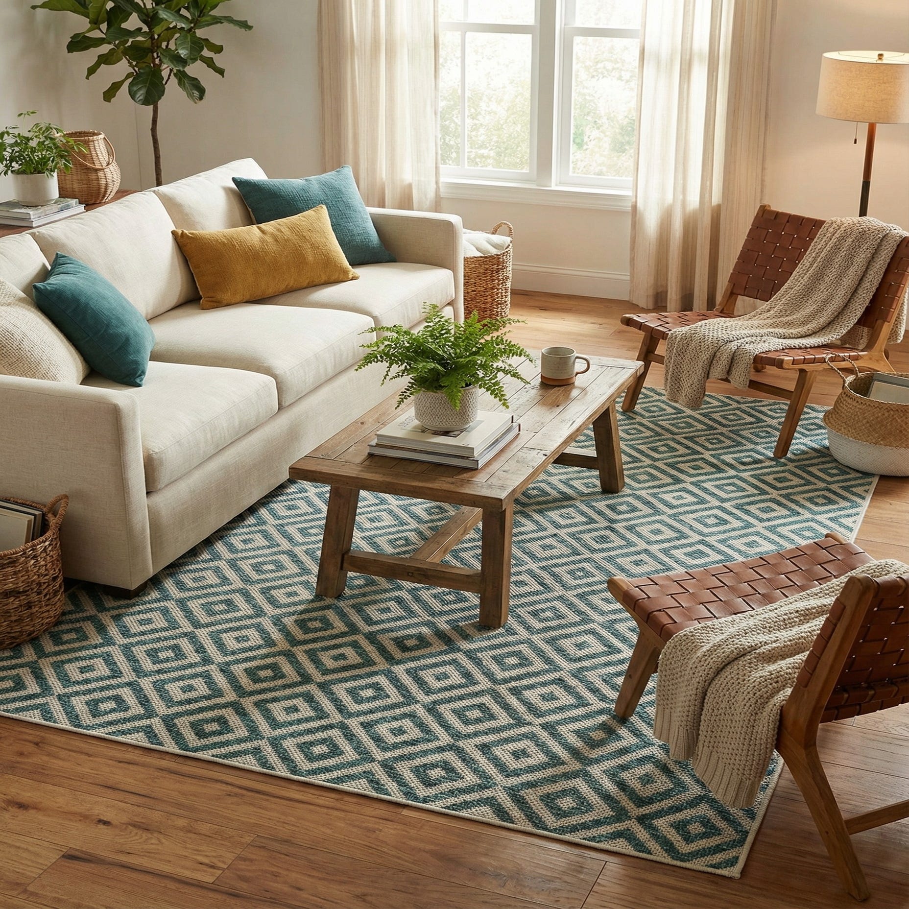 Primary color is Teal. Colors in this rug include: Teal, Ivory.