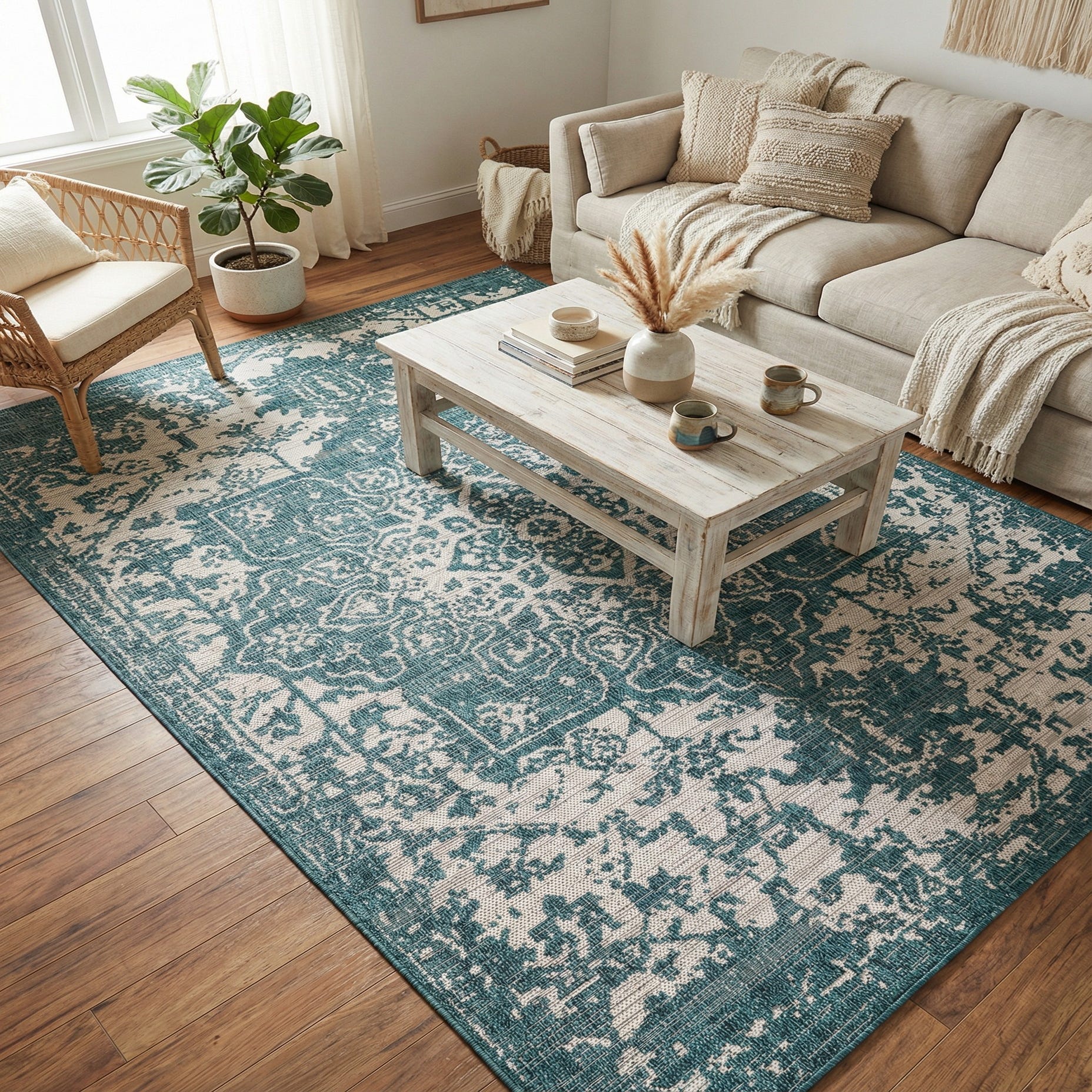 Primary color is Teal. Colors in this rug include: Teal, Ivory.