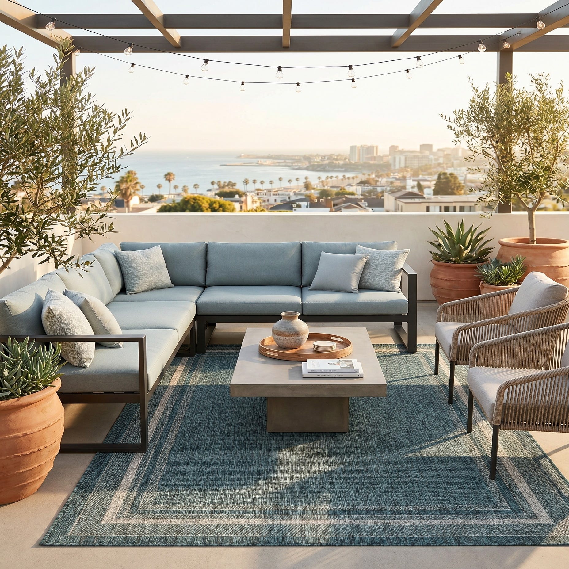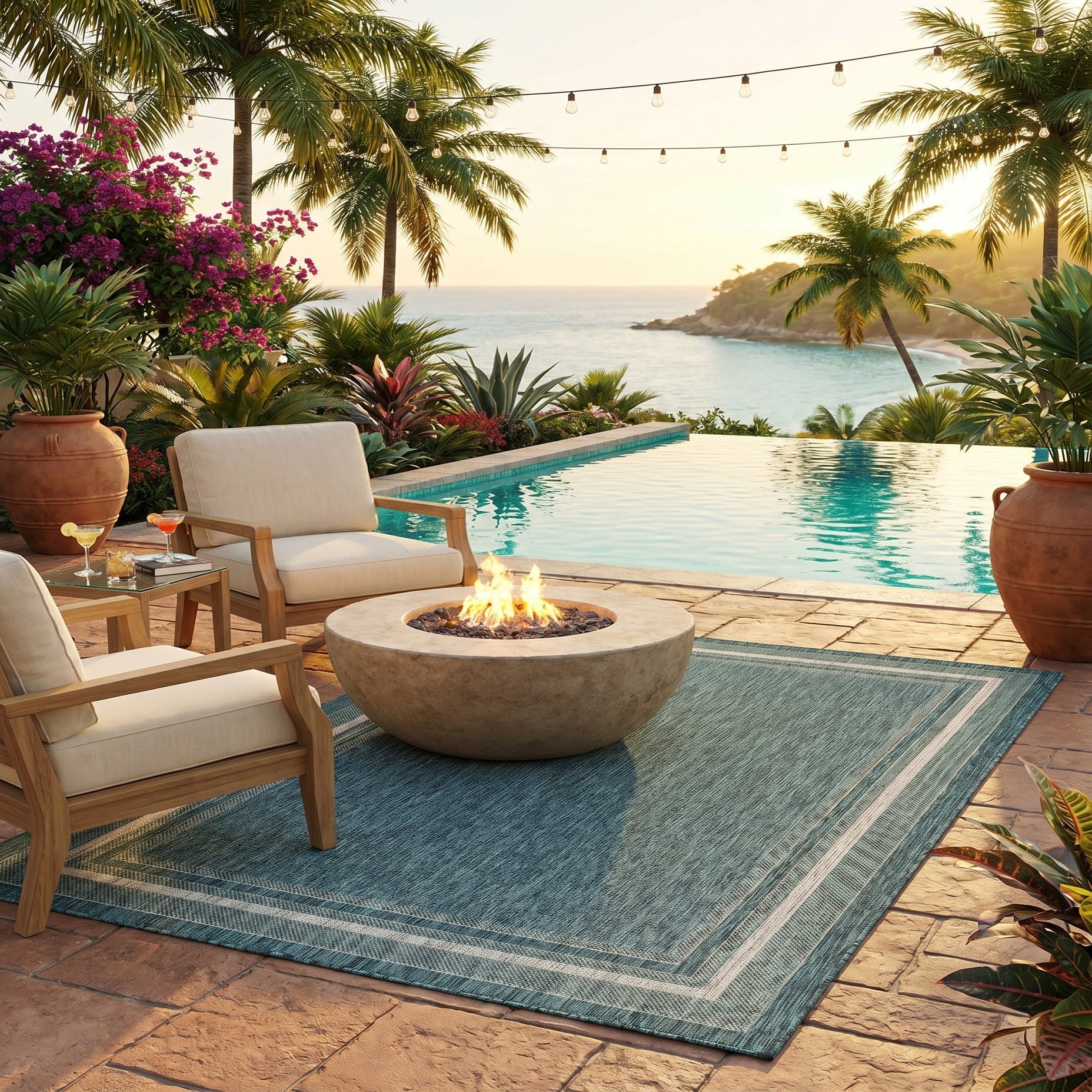 I LOVE this rug. It’s gorgeous. It fits my space perfectly and covers the imperfections of my patio that are waiting to be repaired. I’ve received so many compliments. My outdoor space has never been cozier and more for inviting. The best part is how quickly it dries after a rain. I am thoroughly impressed by the quality and craftsmanship of this rug.