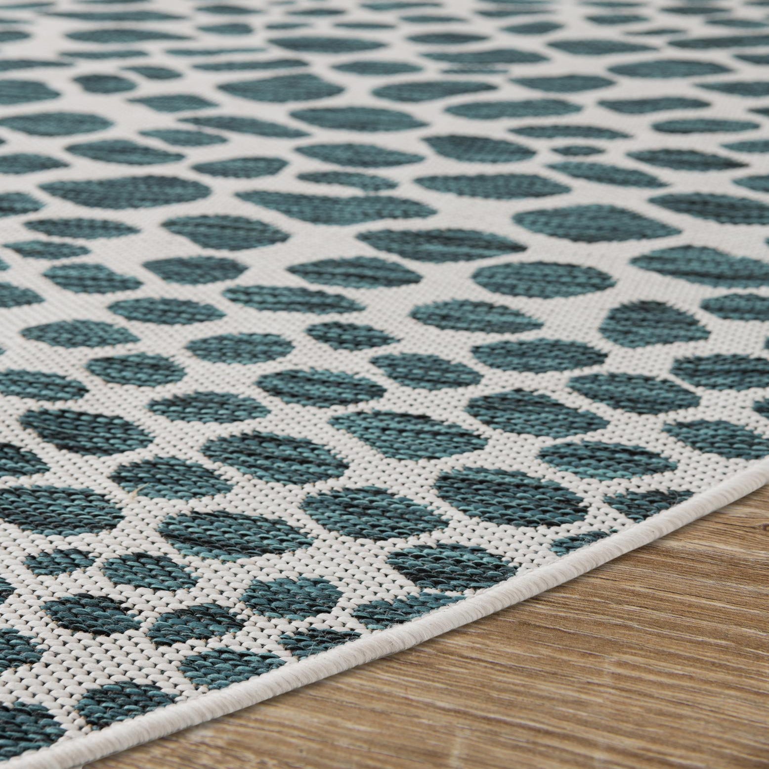 Primary color is Teal. Colors in this rug include: Teal, Ivory.