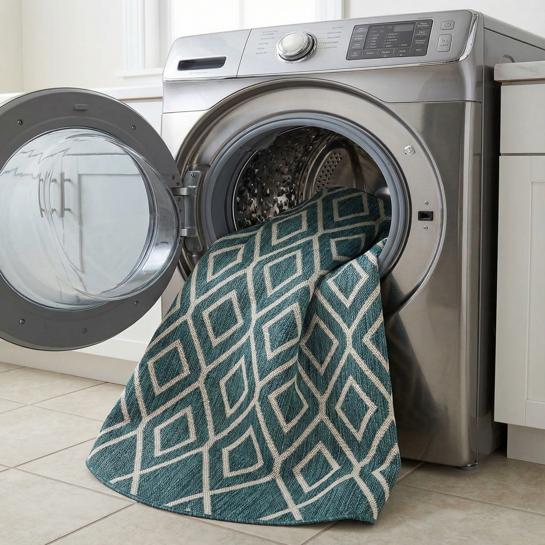 Primary color is Teal. Colors in this rug include: Teal, Ivory.