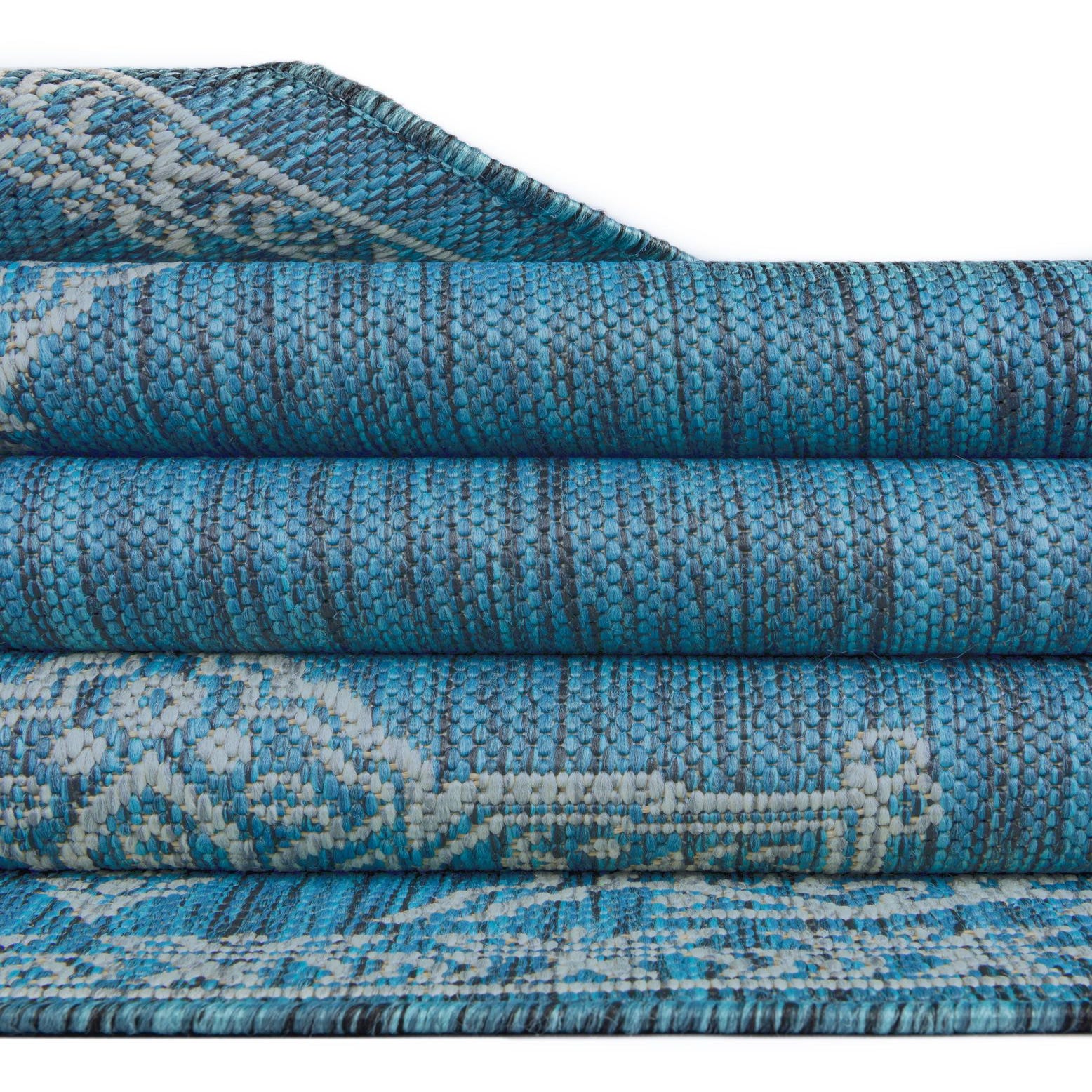 Primary color is Teal. Colors in this rug include: Teal, Gray, Ivory.