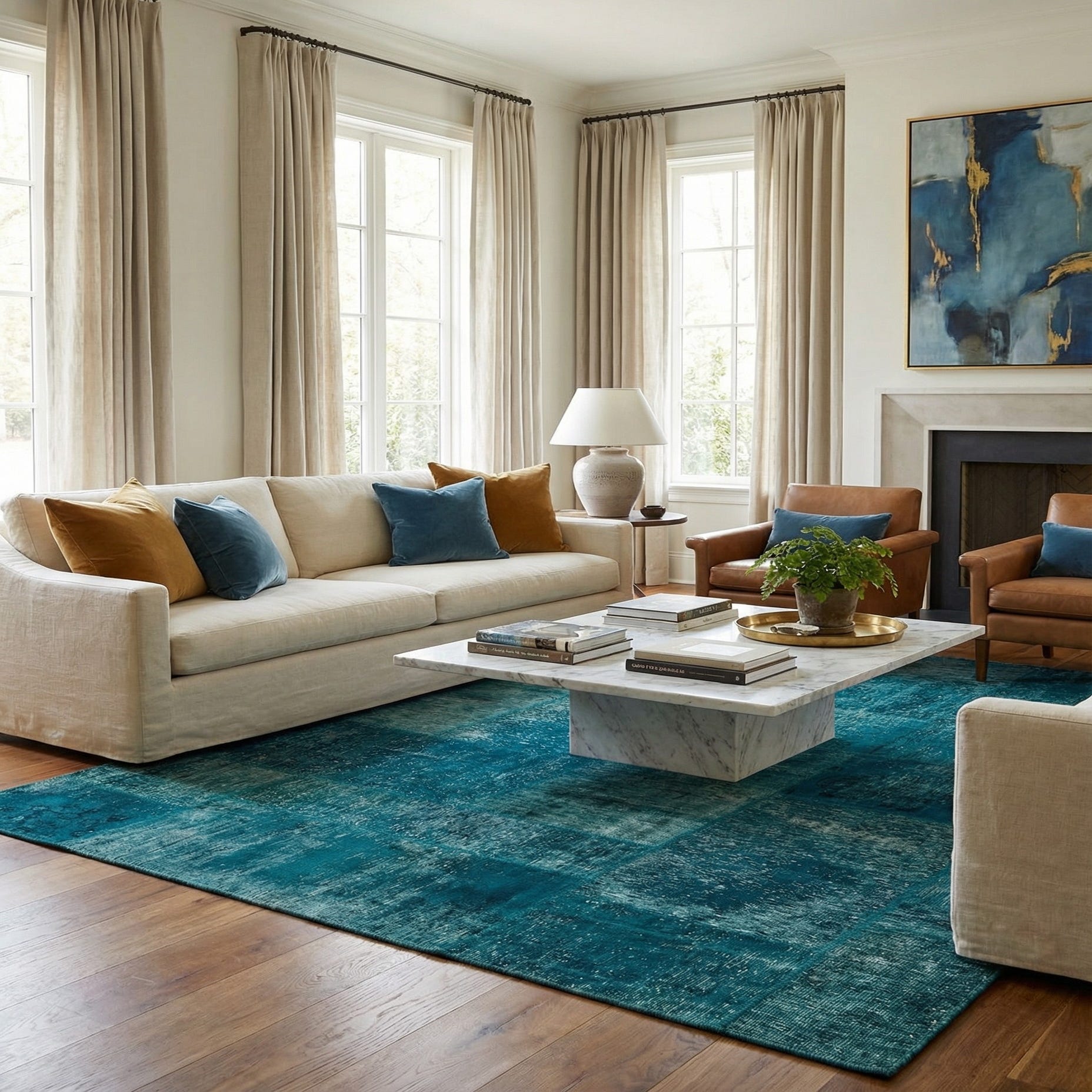Primary color is Teal. Colors in this rug include: Teal, Green, Ivory.