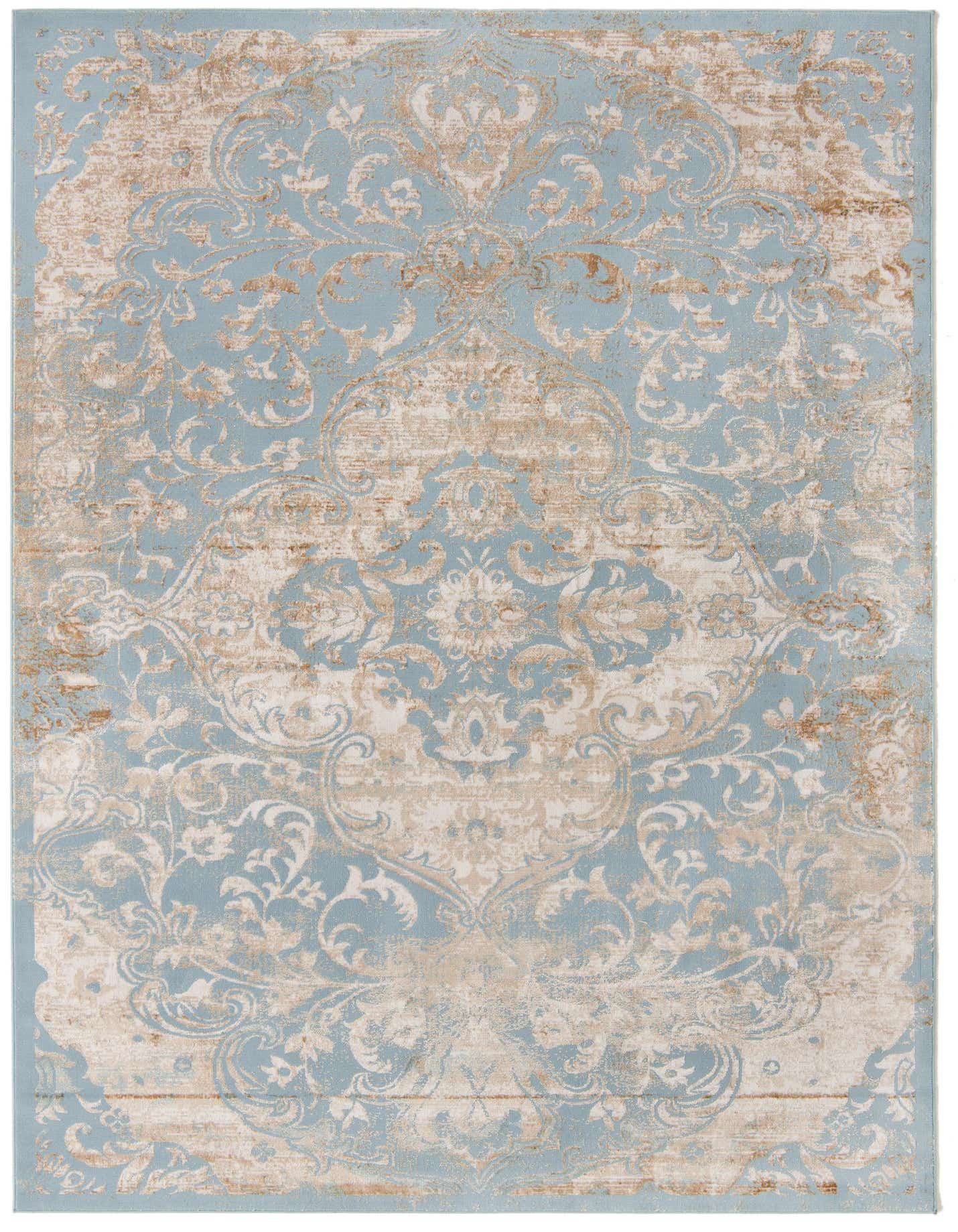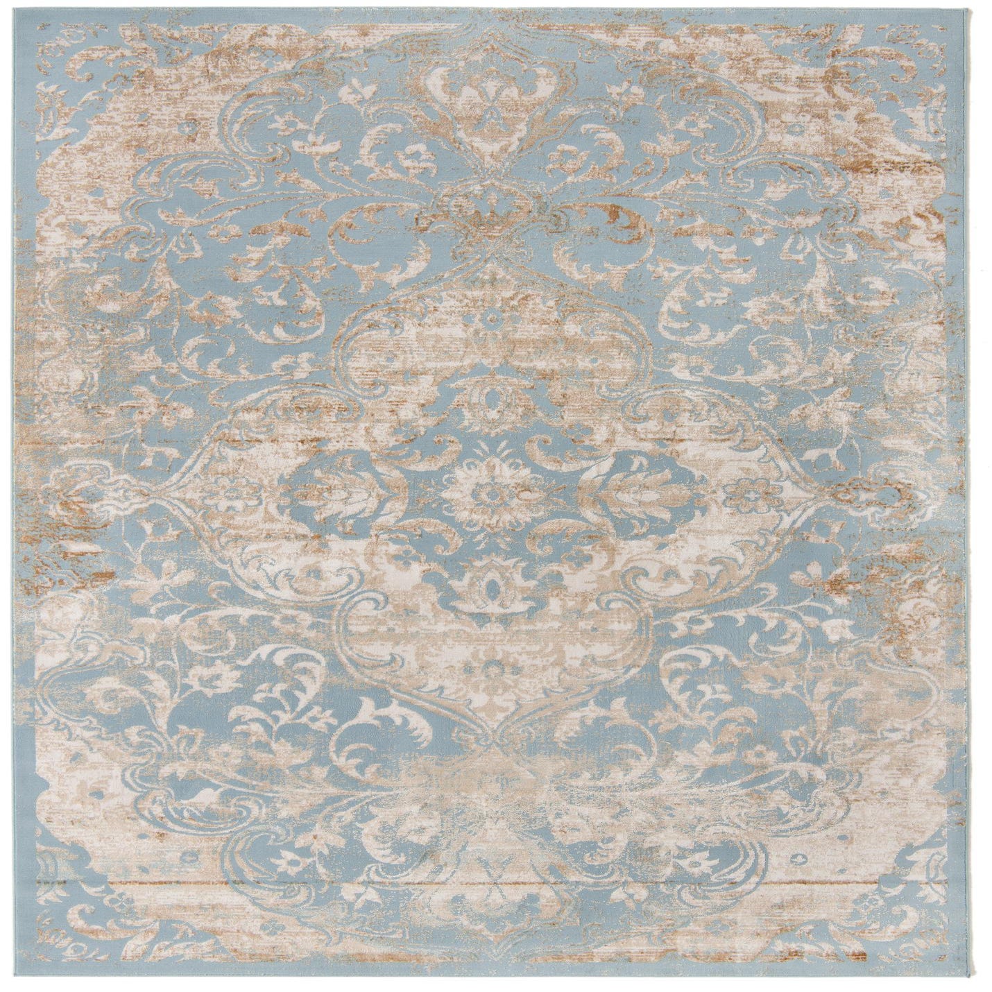 Primary color is Teal. Colors in this rug include: Teal, Gray, Light Brown, Ivory.