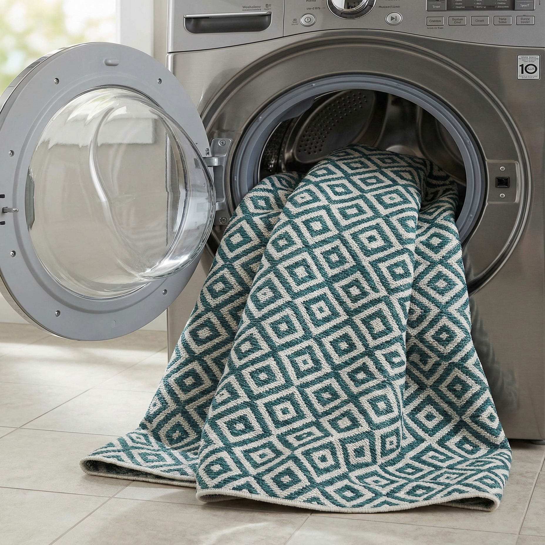 Primary color is Teal. Colors in this rug include: Teal, Ivory.