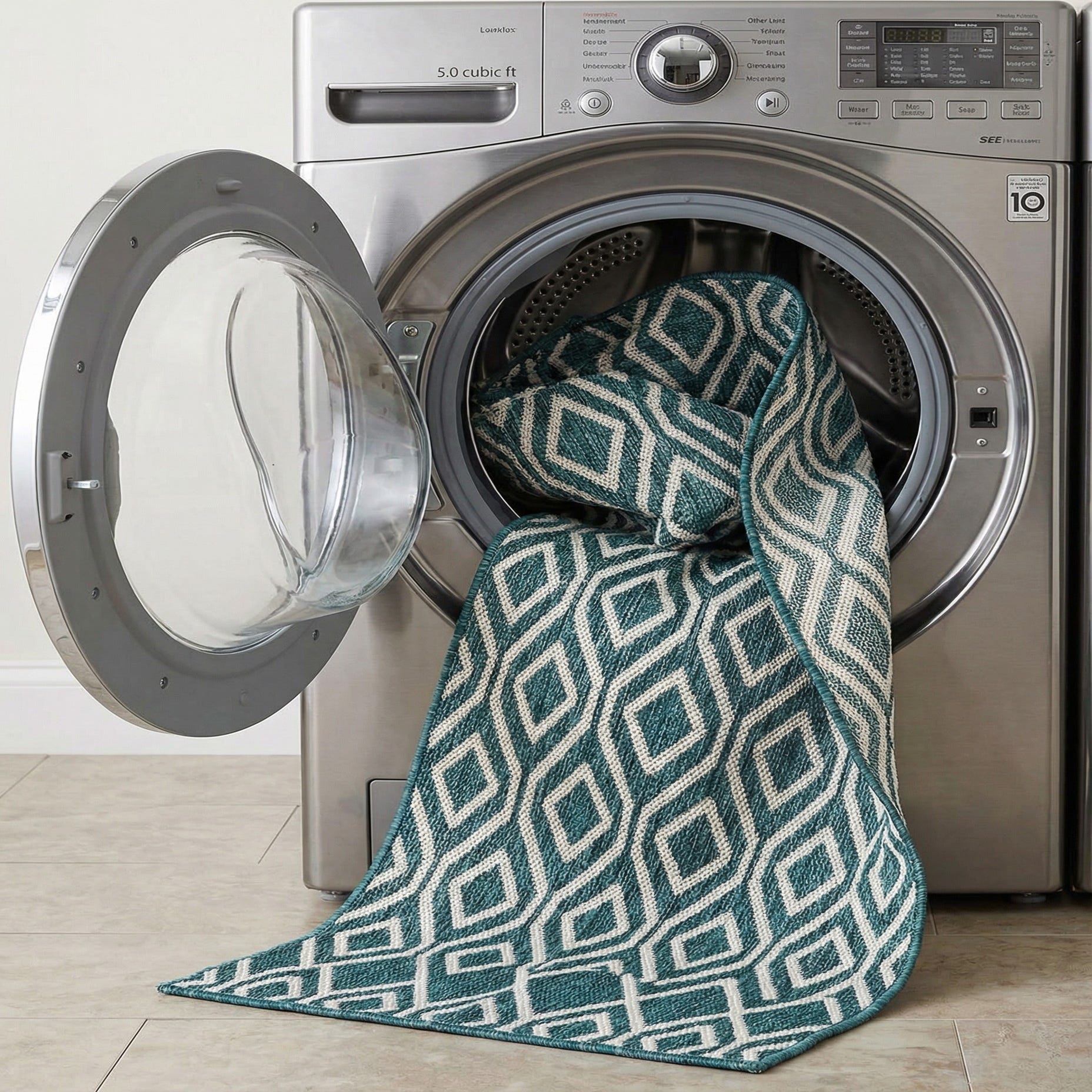 Primary color is Teal. Colors in this rug include: Teal, Ivory.