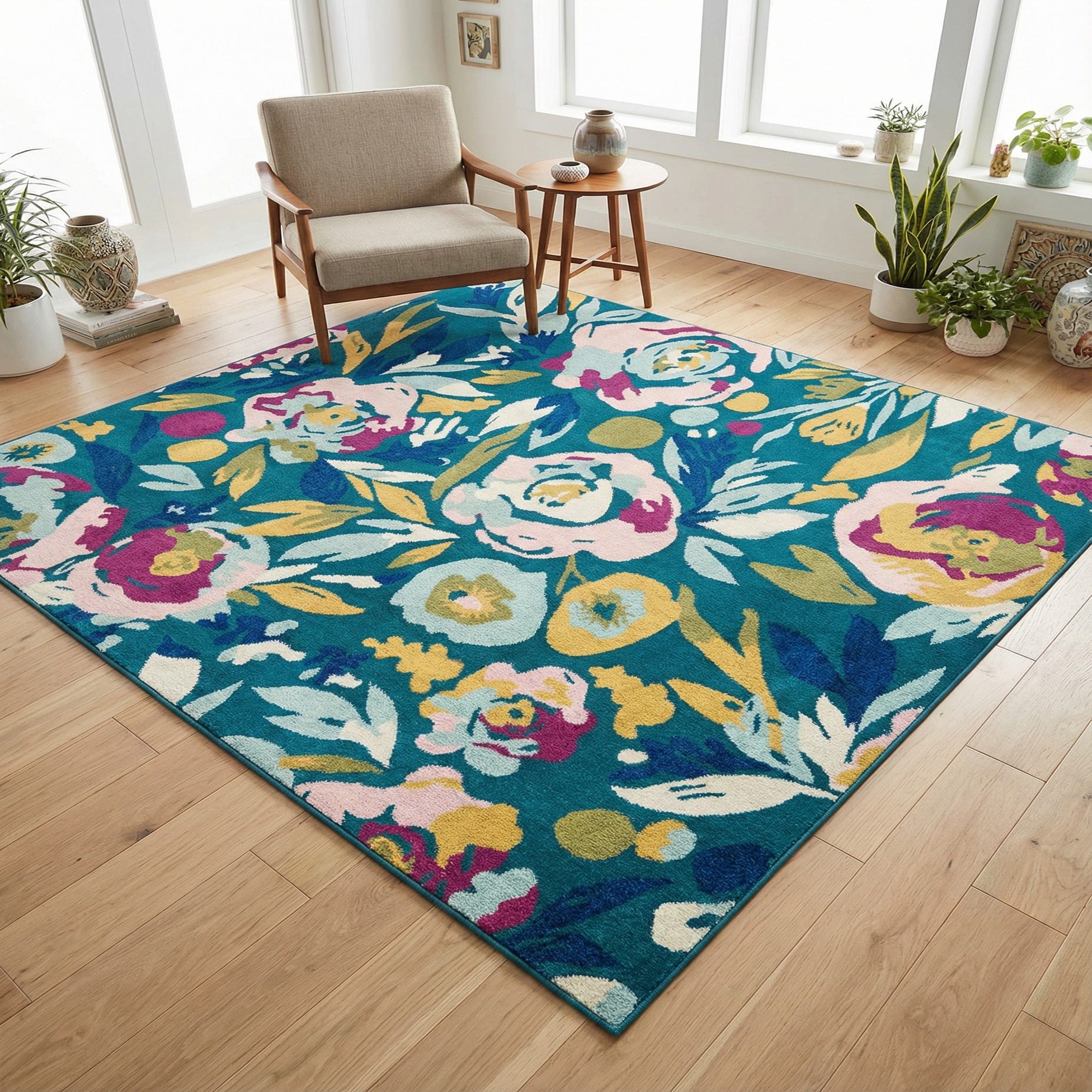 Primary color is Teal. Colors in this rug include: Teal, Green, Ivory, Light Blue, Purple, Yellow, Pink, Navy Blue.