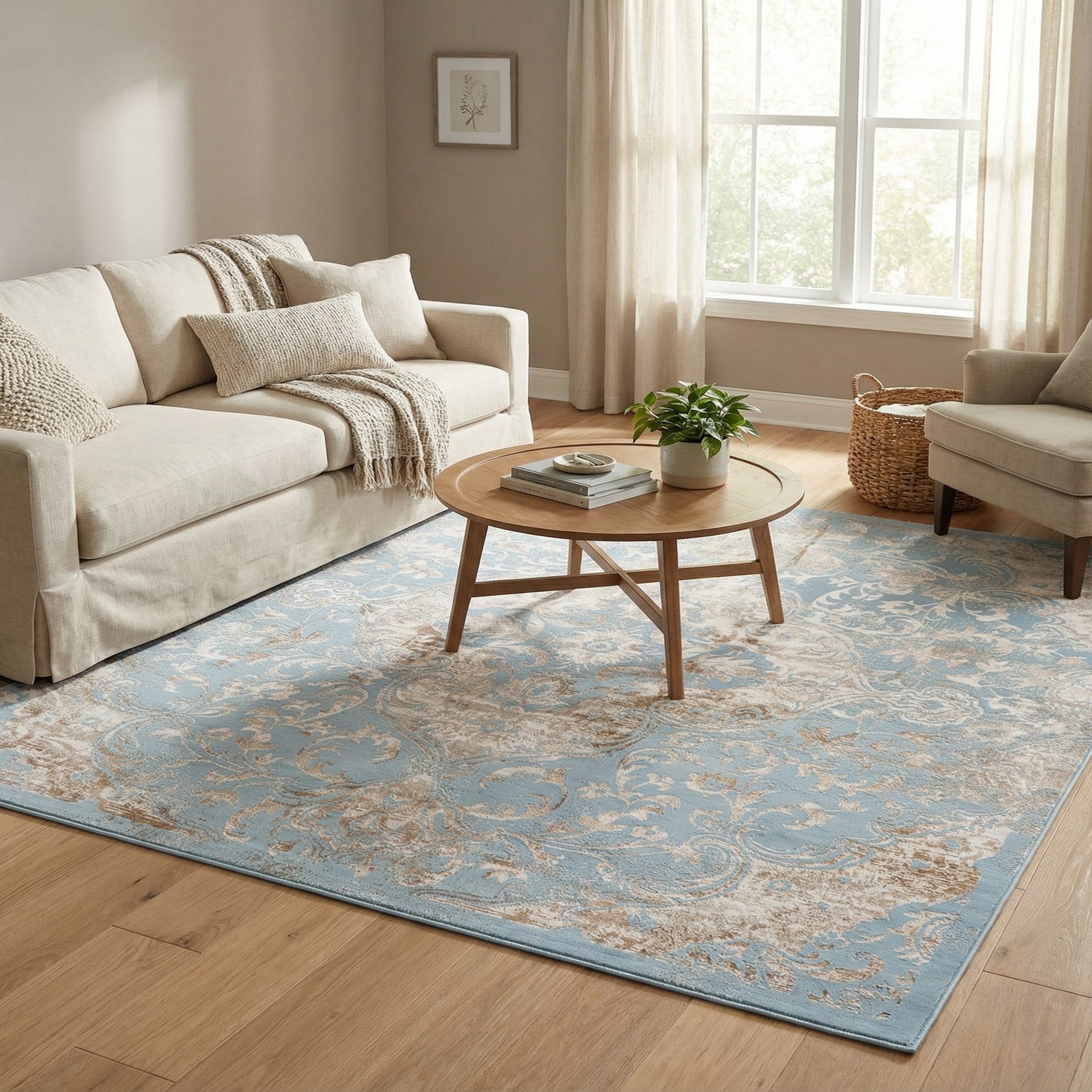 Primary color is Teal. Colors in this rug include: Teal, Beige, Brown.