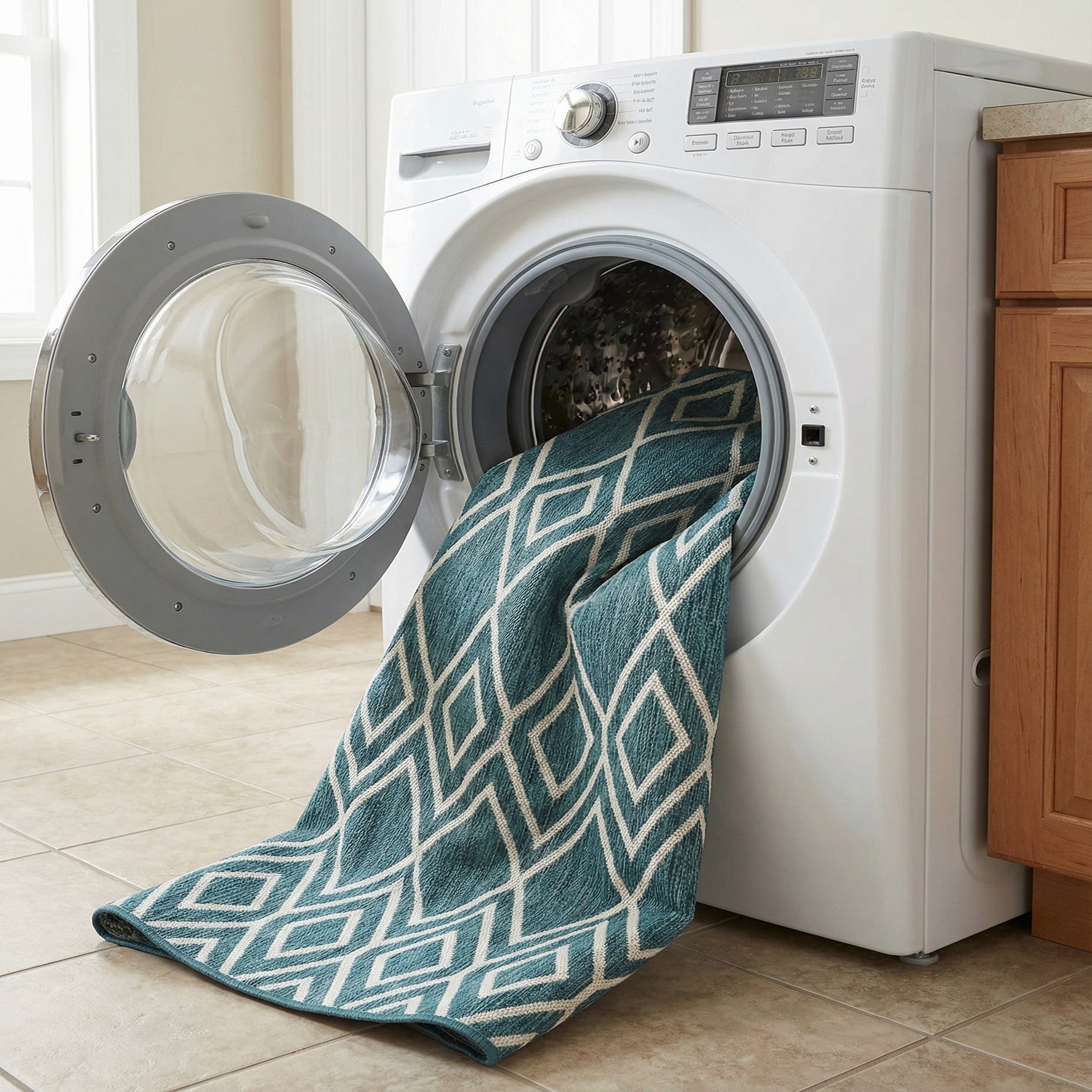Primary color is Teal. Colors in this rug include: Teal, Ivory.