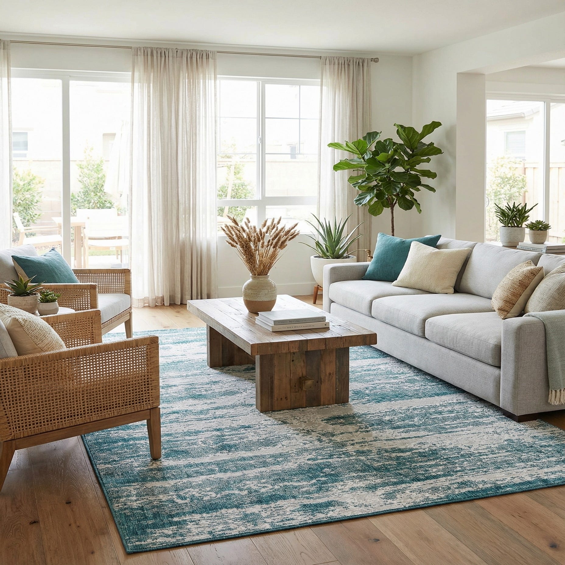 Primary color is Teal. Colors in this rug include: Teal, Ivory.