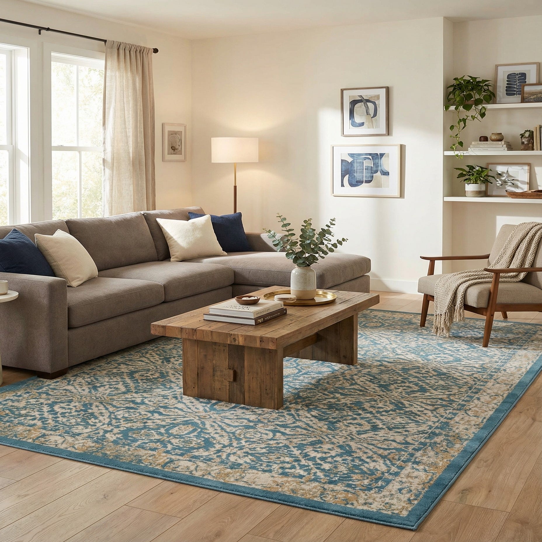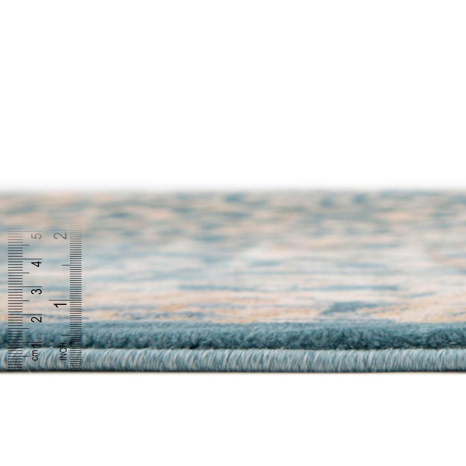 Primary color is Teal. Colors in this rug include: Teal, Cream, Gray, Beige, Light Blue.