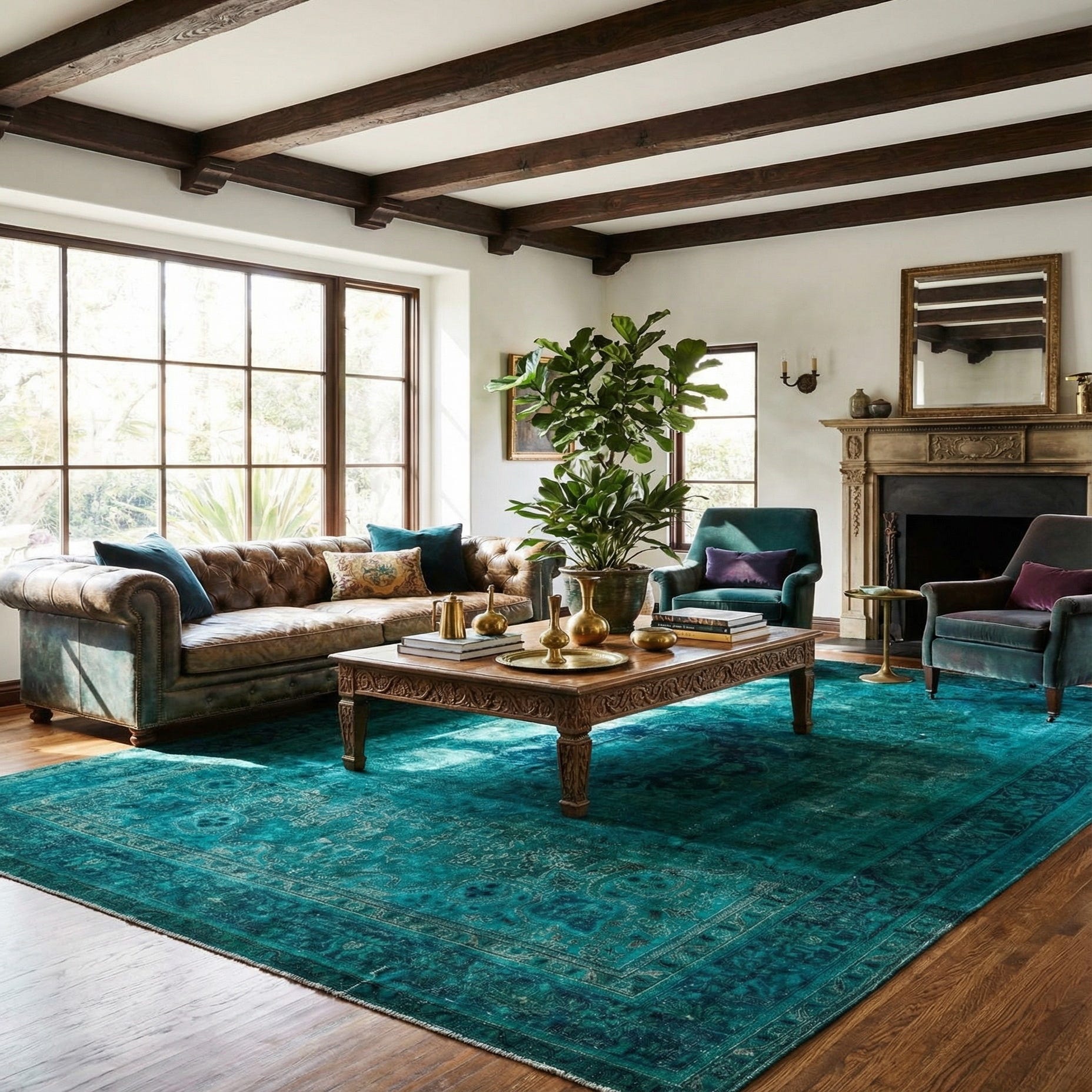 Primary color is Teal. Colors in this rug include: Teal, Blue, Light Brown.