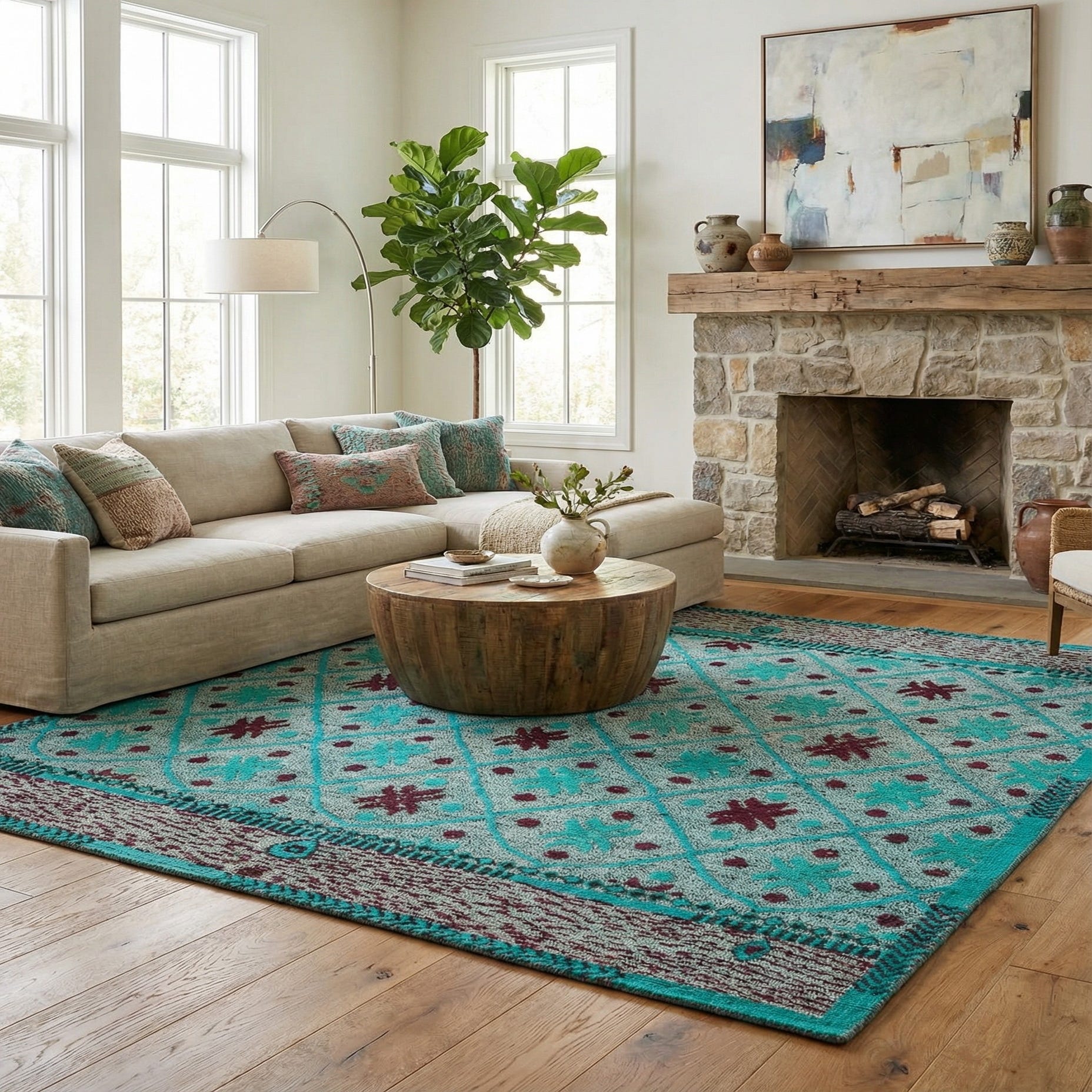 Primary color is Teal. Colors in this rug include: Teal, Burgundy, Ivory, Black.