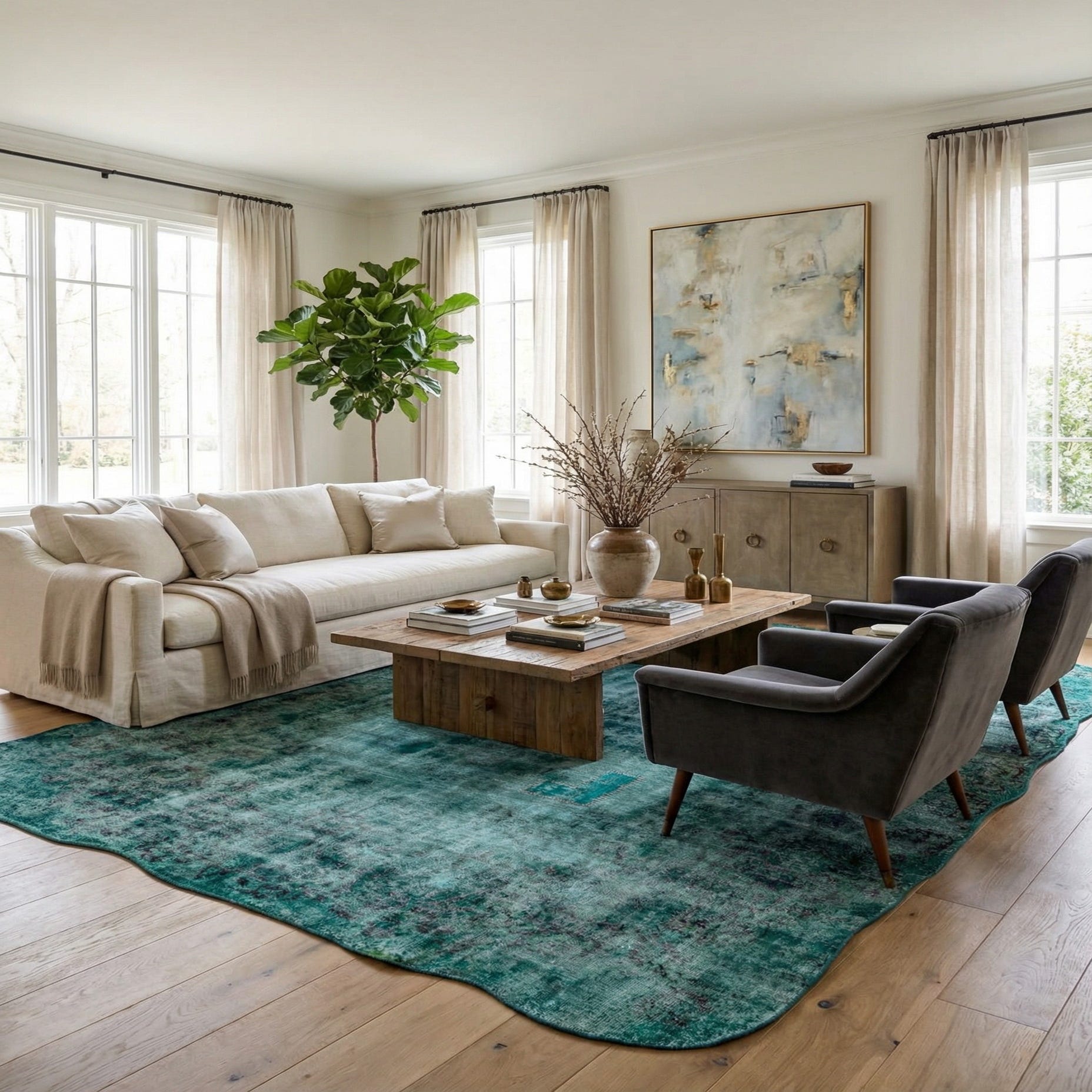 Primary color is Teal. Colors in this rug include: Teal, Black, Hunter Green, Ivory, Blue.
