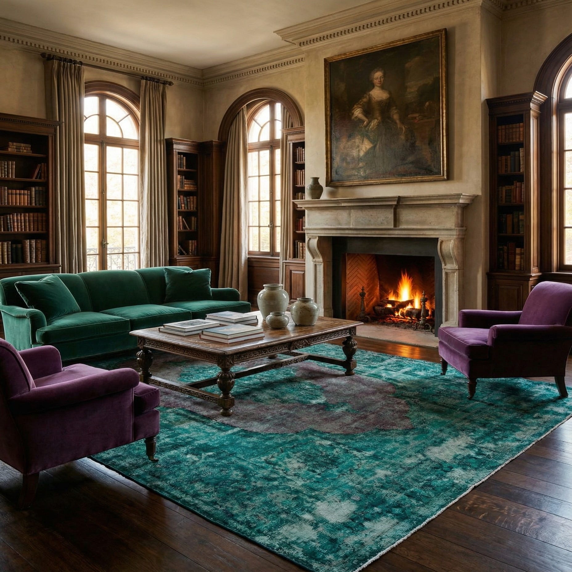 Primary color is Teal. Colors in this rug include: Teal, Black, Navy Blue, Burgundy.