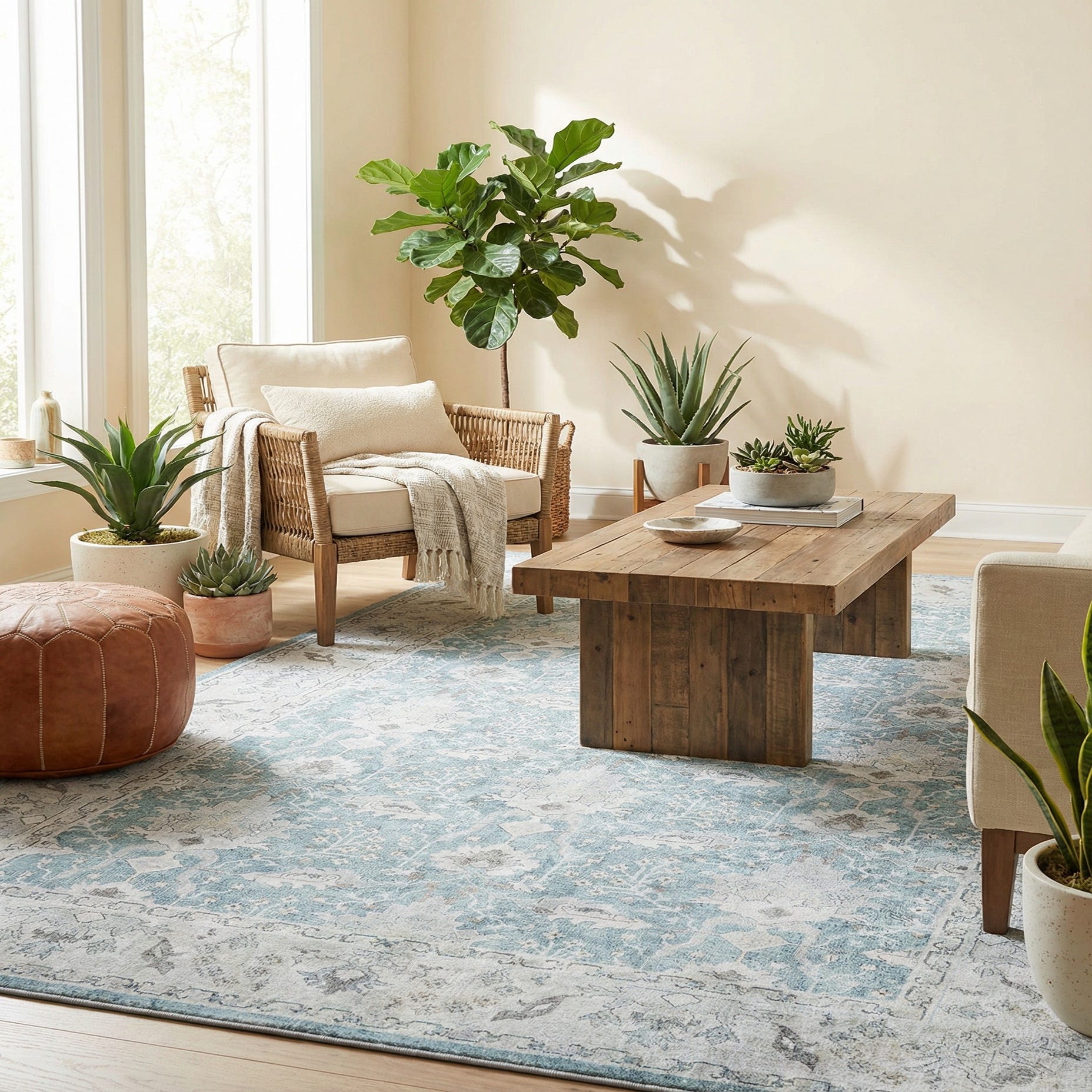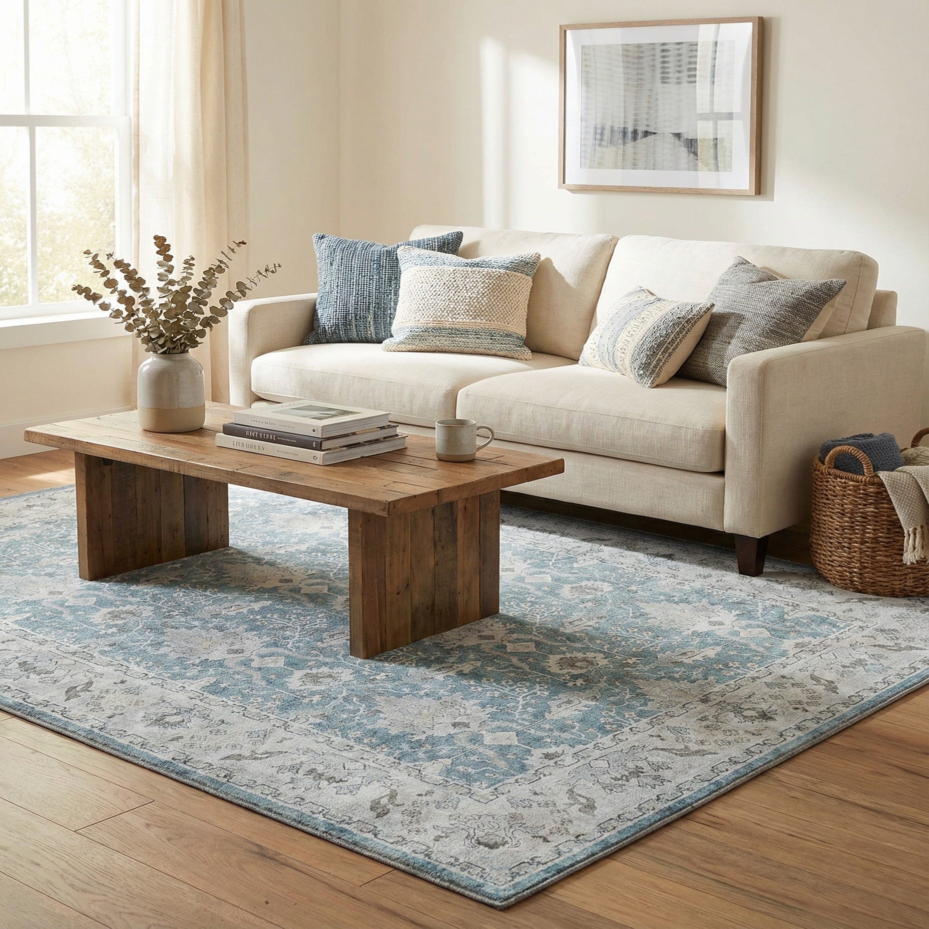Primary color is Teal blue. Colors in this rug include: Teal blue, Black, Ivory, Gray.