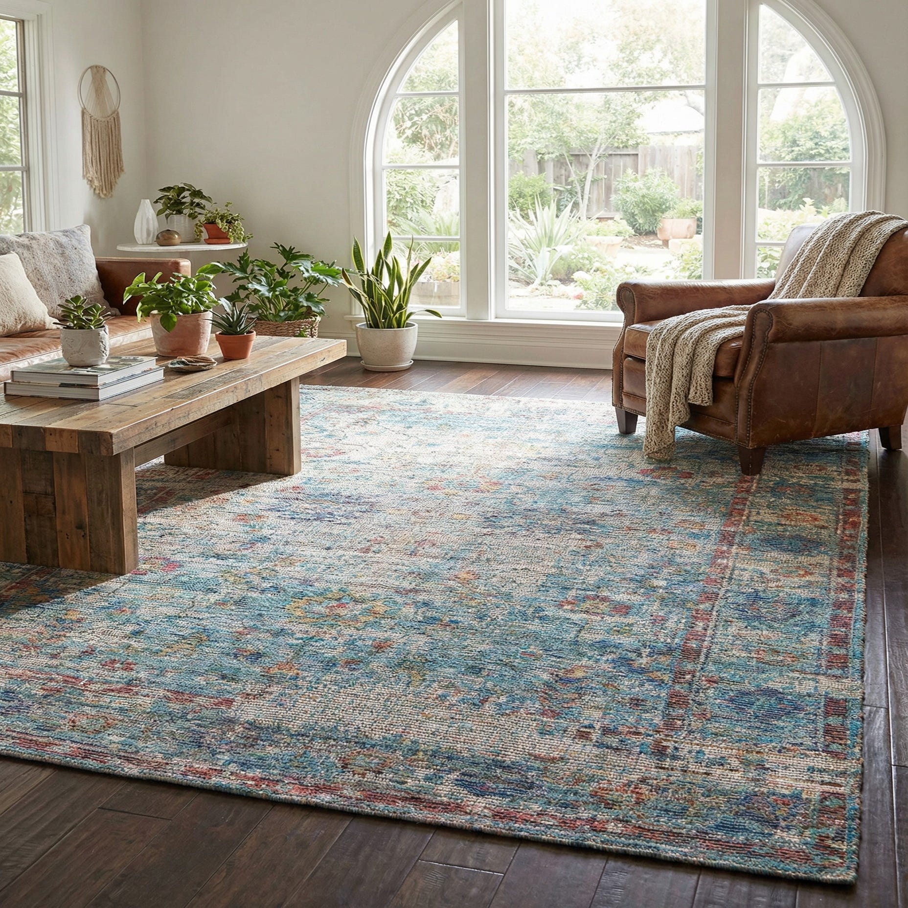 Primary color is Teal blue. Colors in this rug include: Teal blue, Gray, Green, Navy Blue, Terracotta, Yellow.