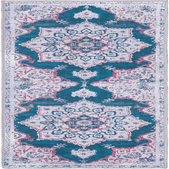 Primary color is Teal Green. Colors in this rug include: Teal Green, Blue, Gray, Red, Black.