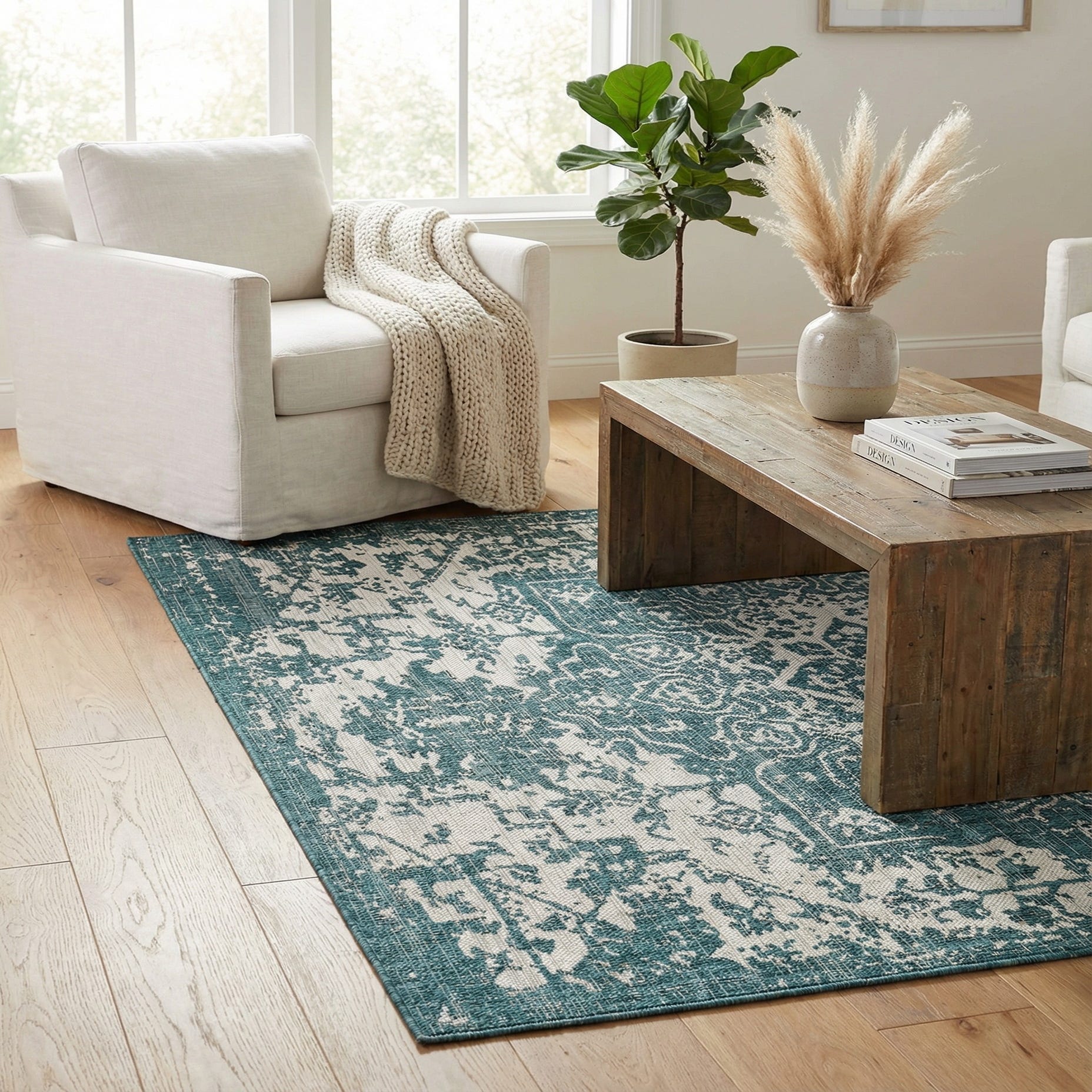 Primary color is Teal. Colors in this rug include: Teal, Ivory.