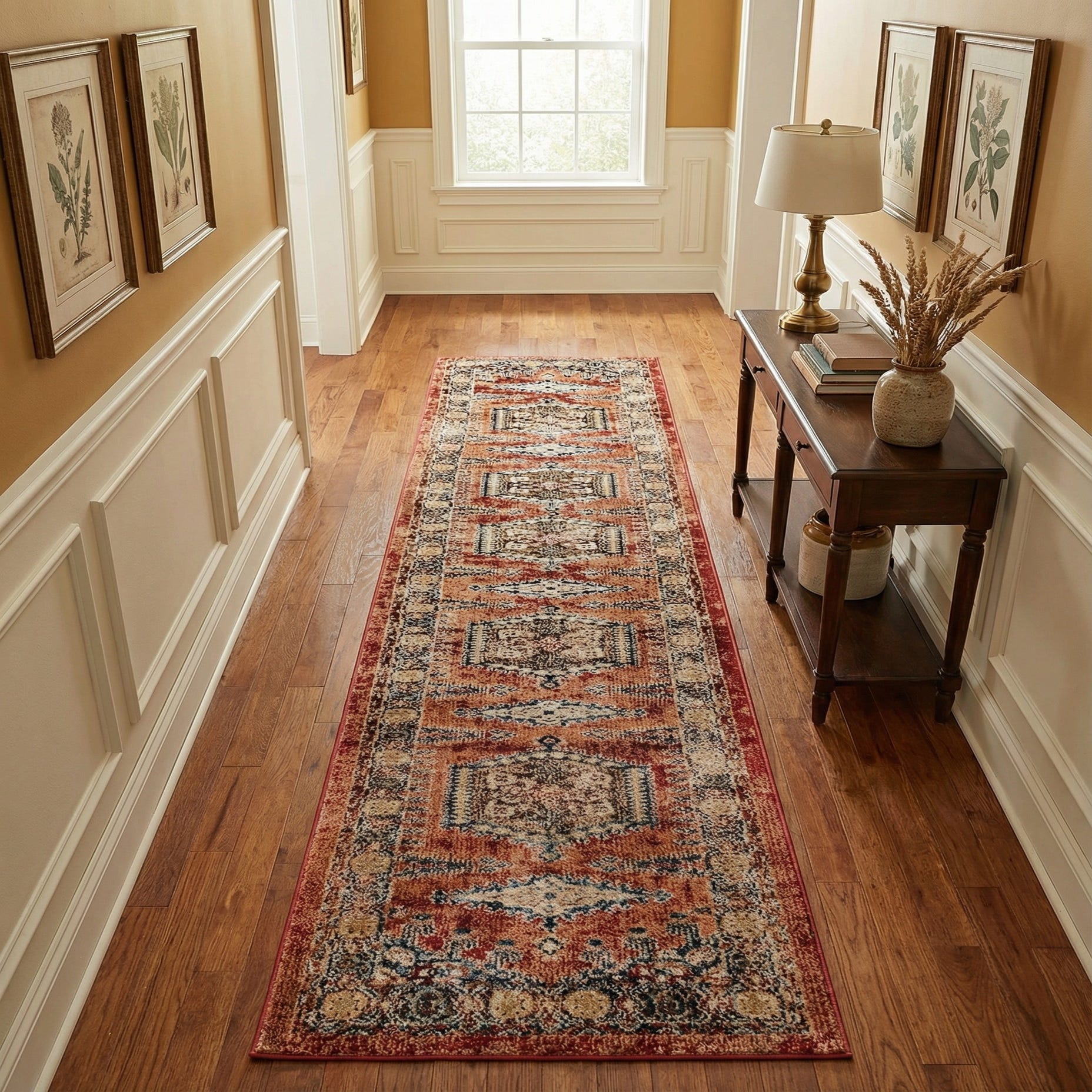 Primary color is Terracotta. Colors in this rug include: Terracotta, Beige, Blue, Brown, Burgundy, Light Blue, Peach.