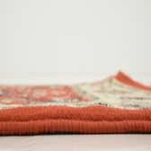 Primary color is Terracotta. Colors in this rug include: Terracotta, Cream, Light Blue, Navy Blue, Orange, Rust Red.