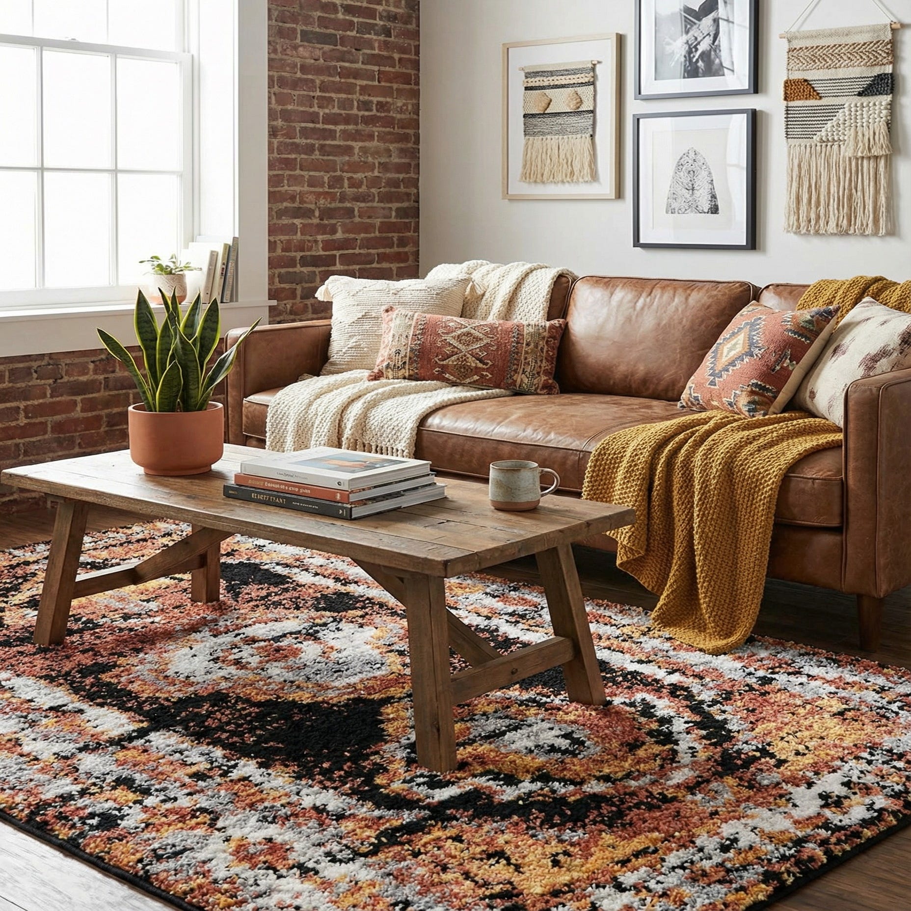 Primary color is Terracotta. Colors in this rug include: Terracotta, Black, Ivory, Light Blue, Yellow.