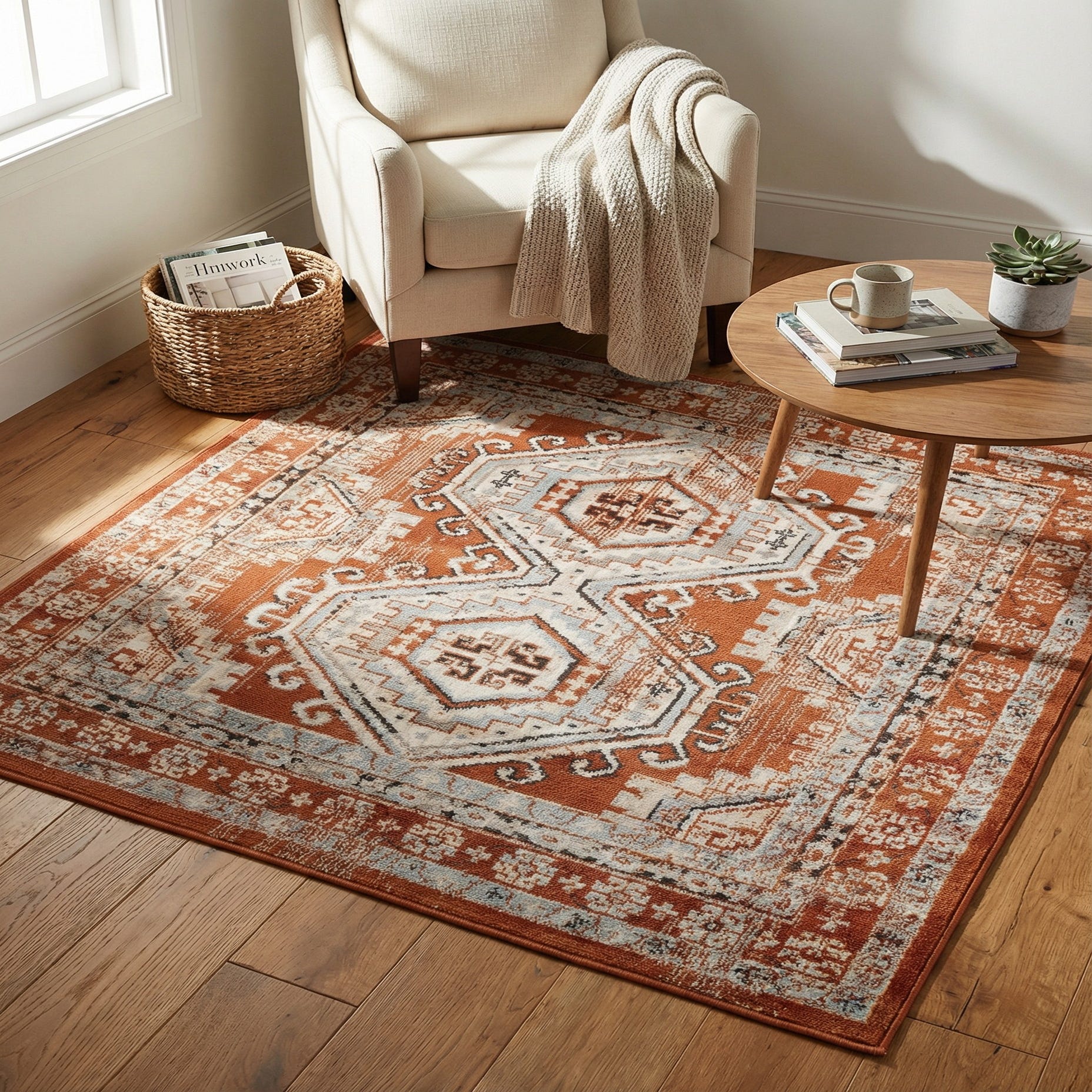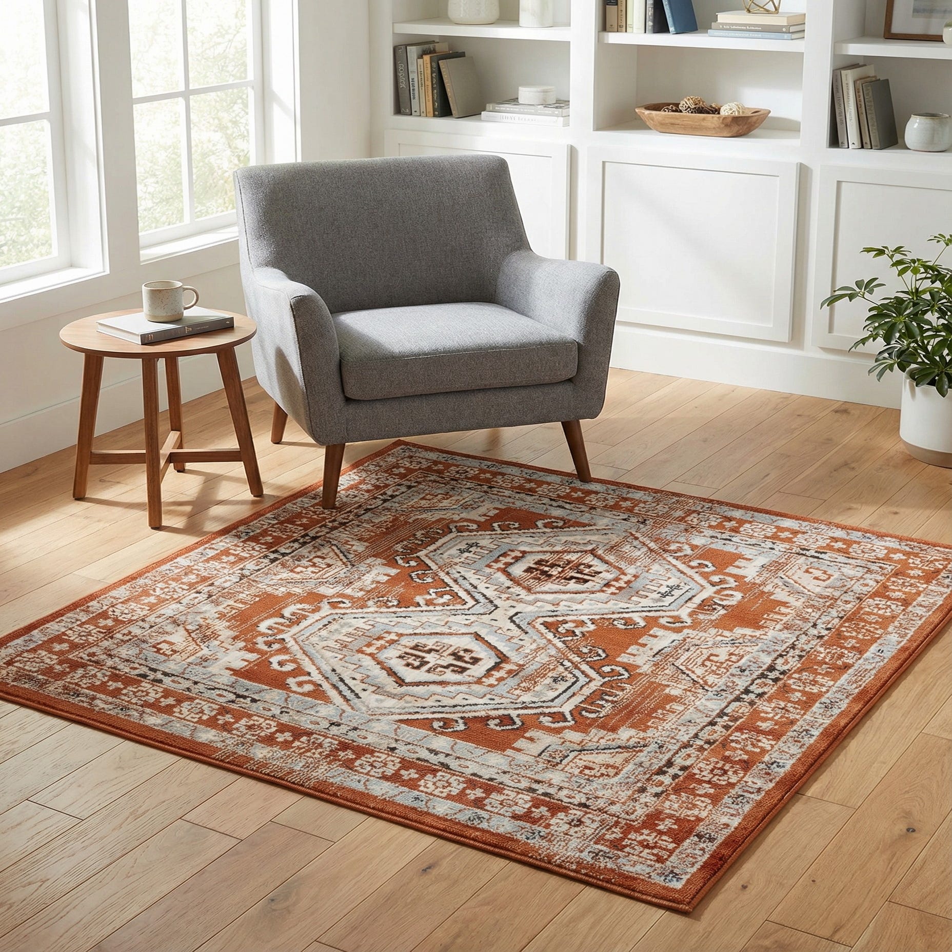 Primary color is Terracotta. Colors in this rug include: Terracotta, Ivory, Gray, Light Blue.