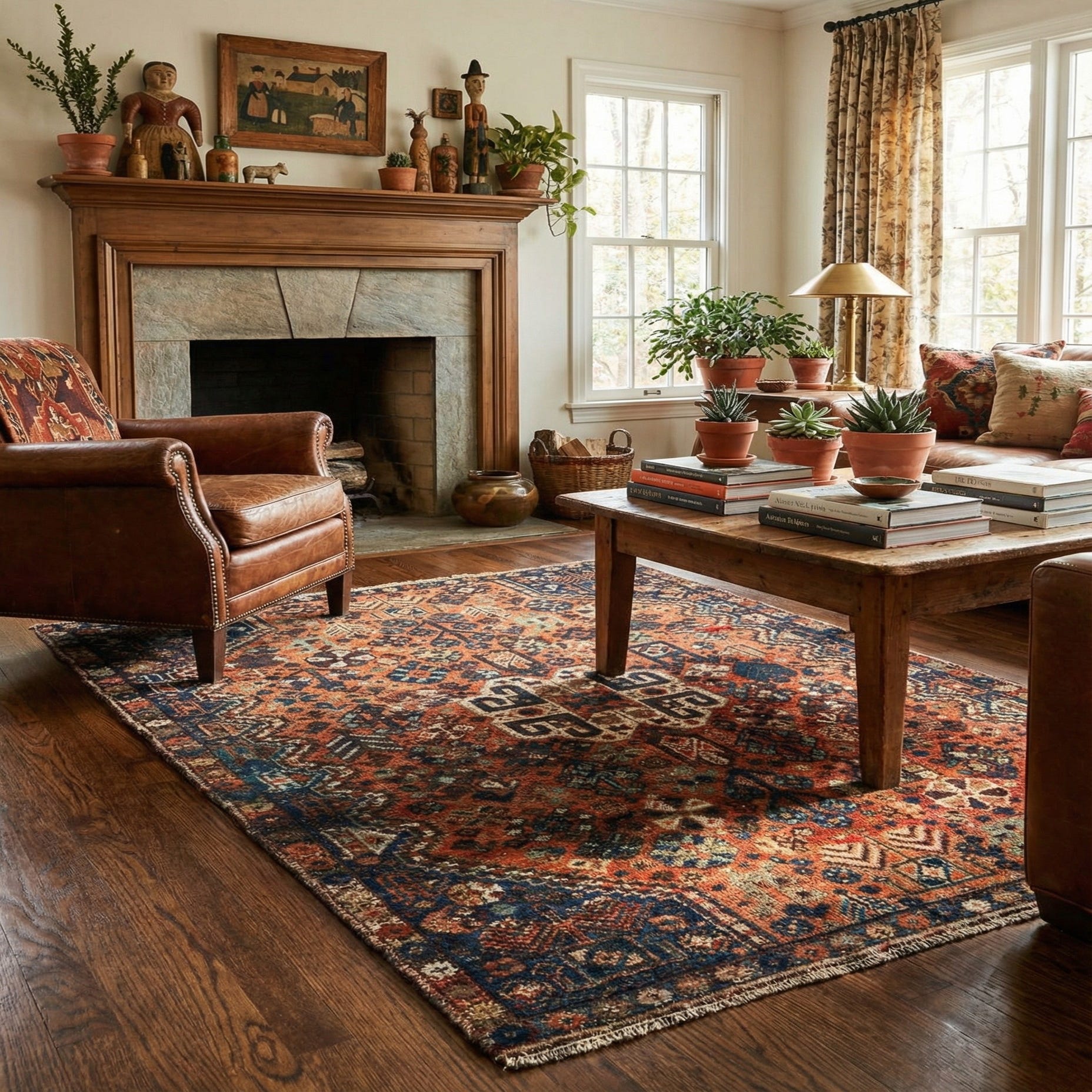 Primary color is Terracotta. Colors in this rug include: Terracotta, Beige, Brown, Burgundy, Ivory, Navy Blue, Light Blue.